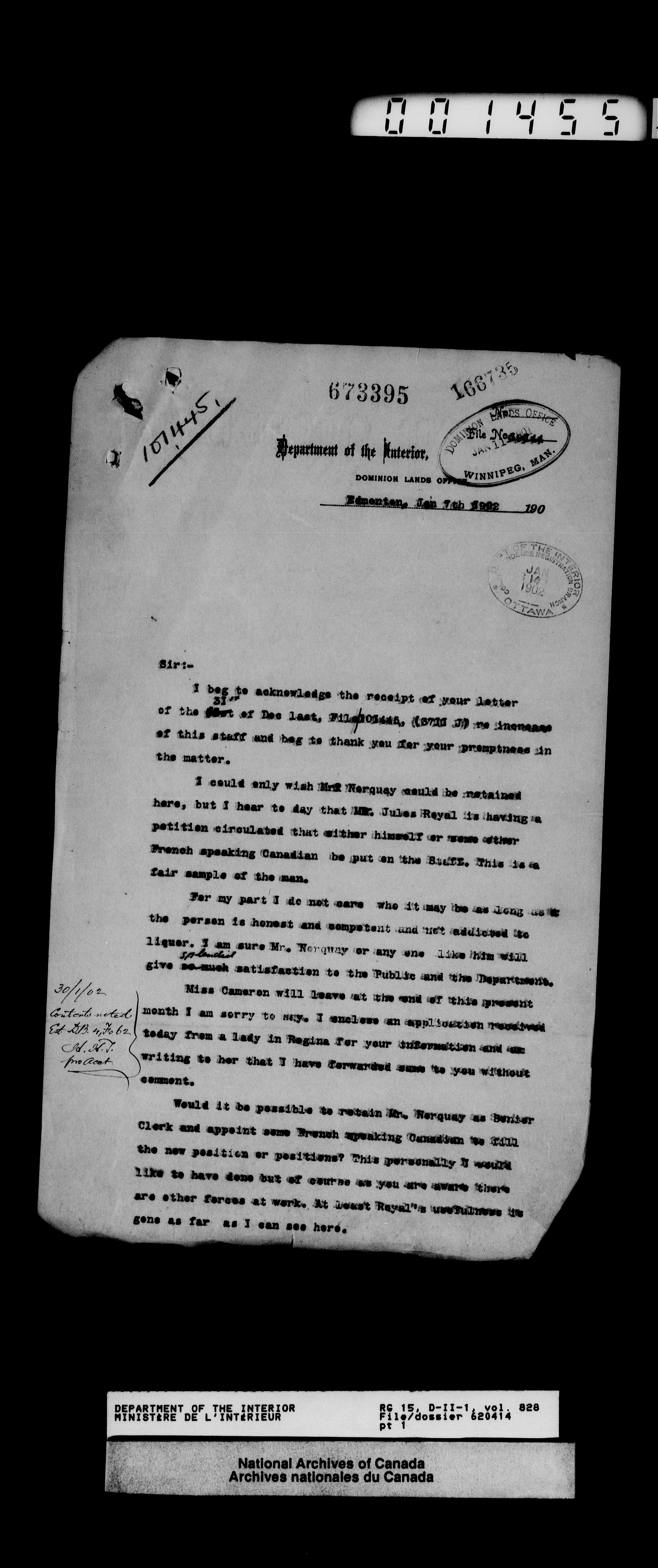 Dominion Lands Branch : Correspondence files : T-14454