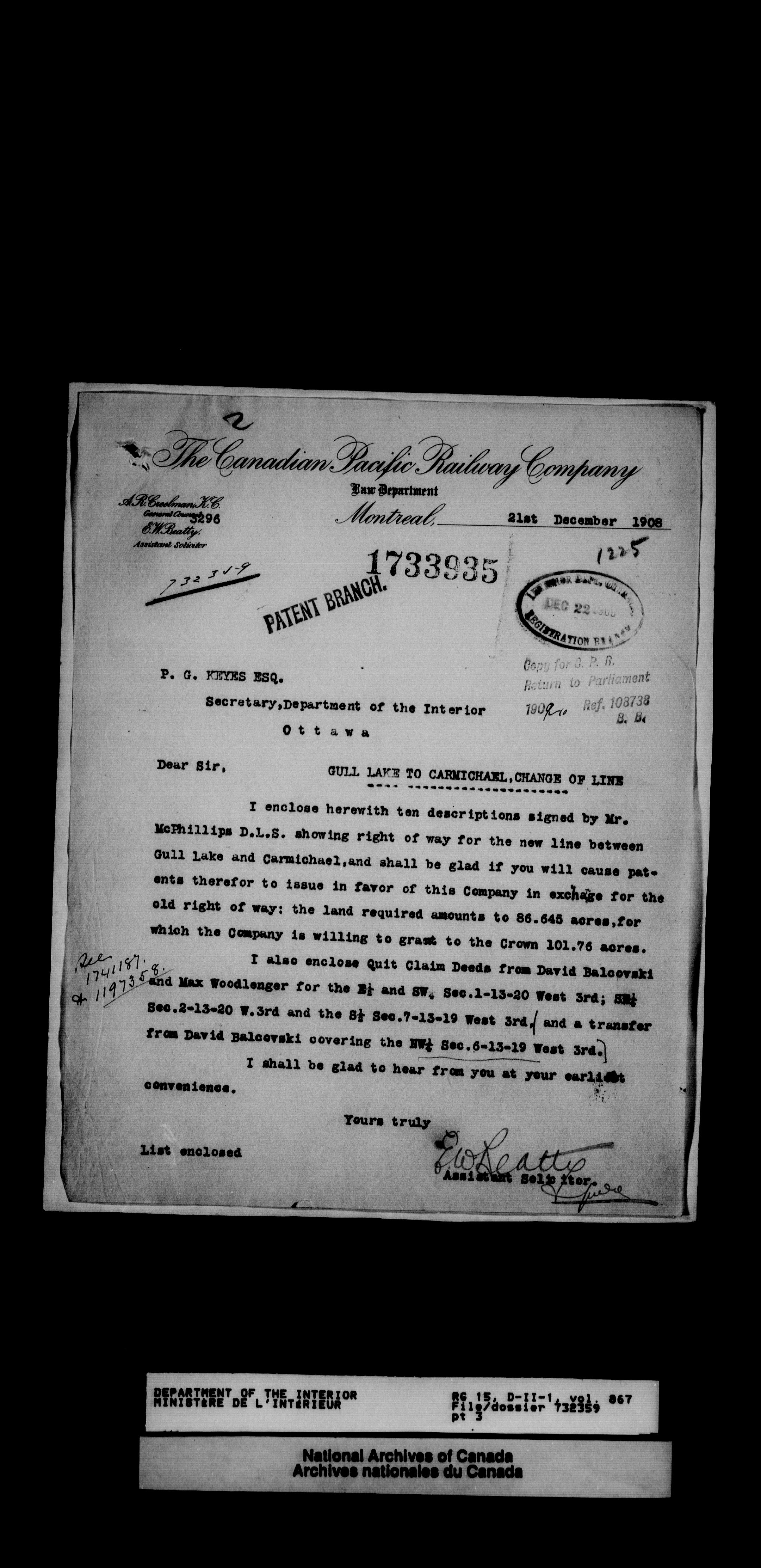 Dominion Lands Branch - Correspondence Files - 14486