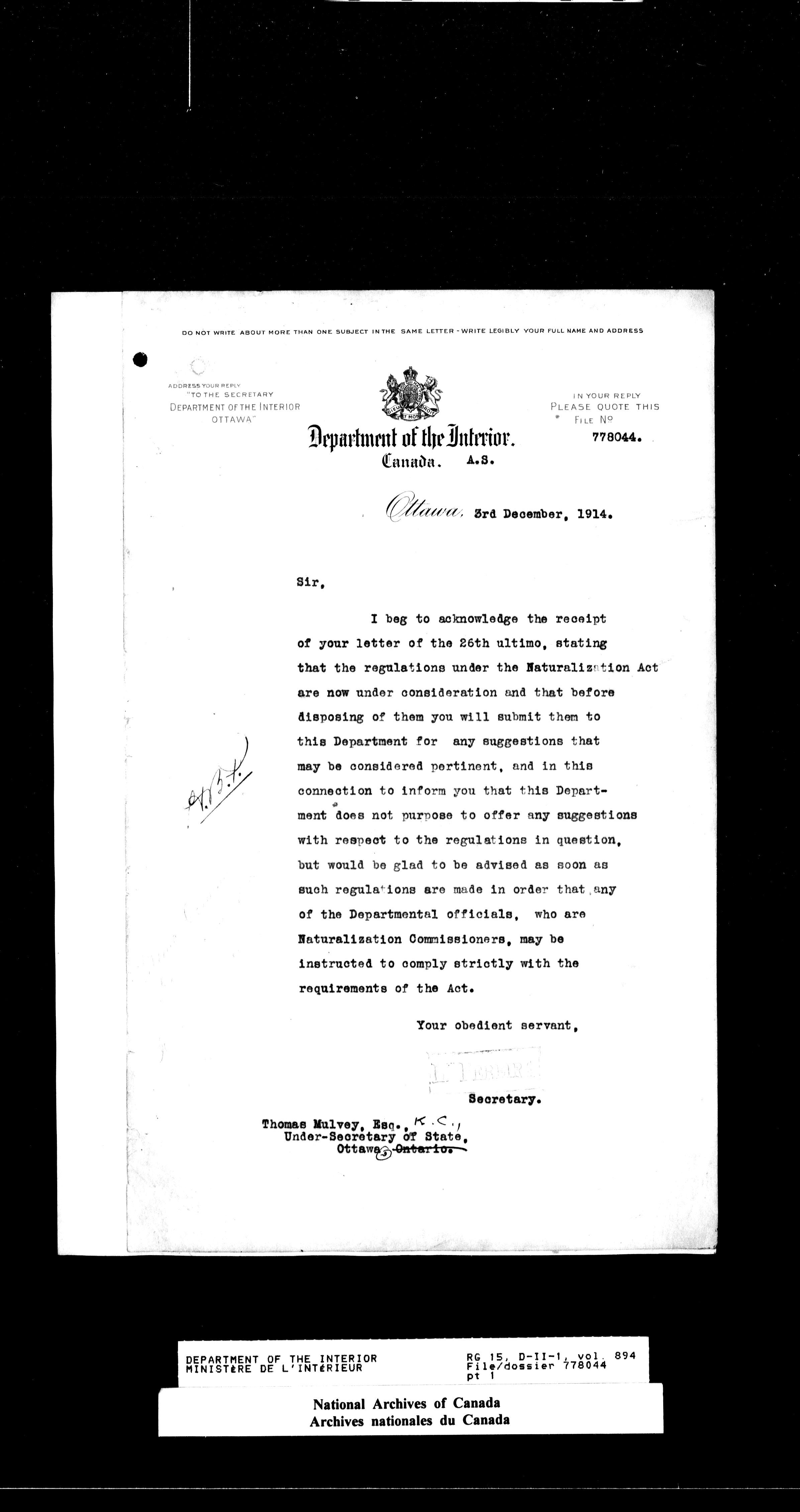Dominion Lands Branch : Correspondence files : T-14507
