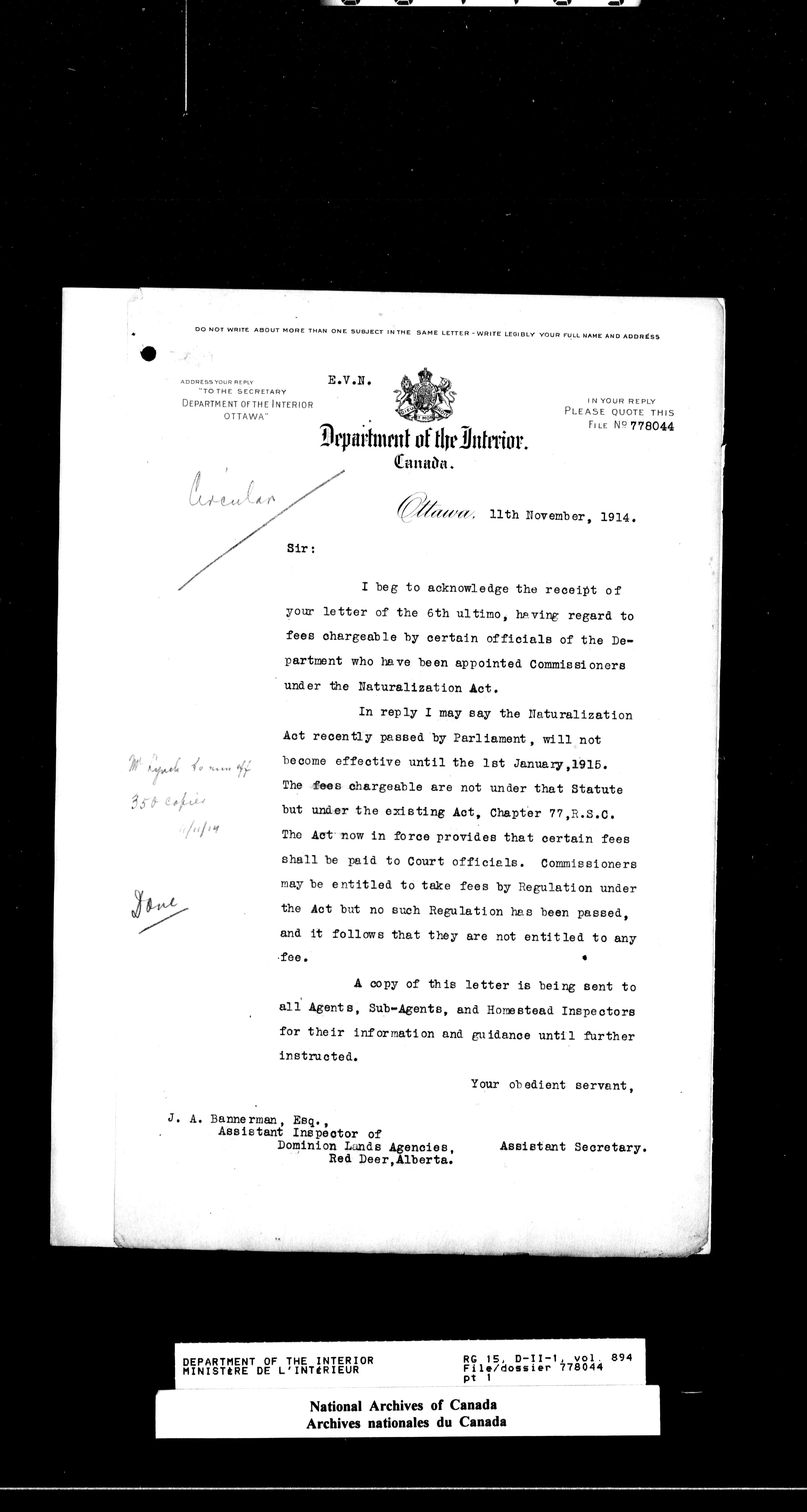 Dominion Lands Branch : Correspondence files : T-14507