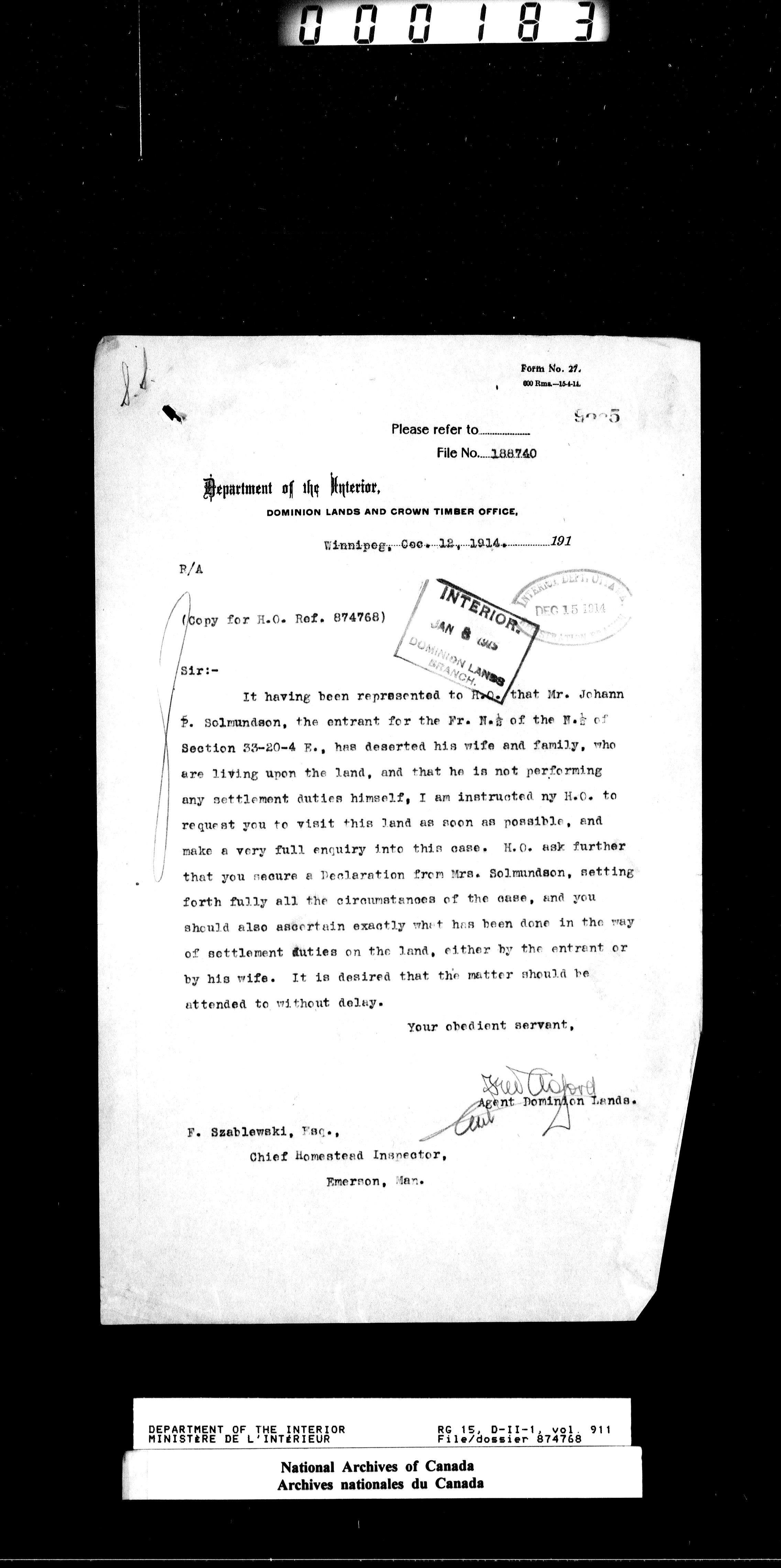 Dominion Lands Branch - Correspondence Files - 14520