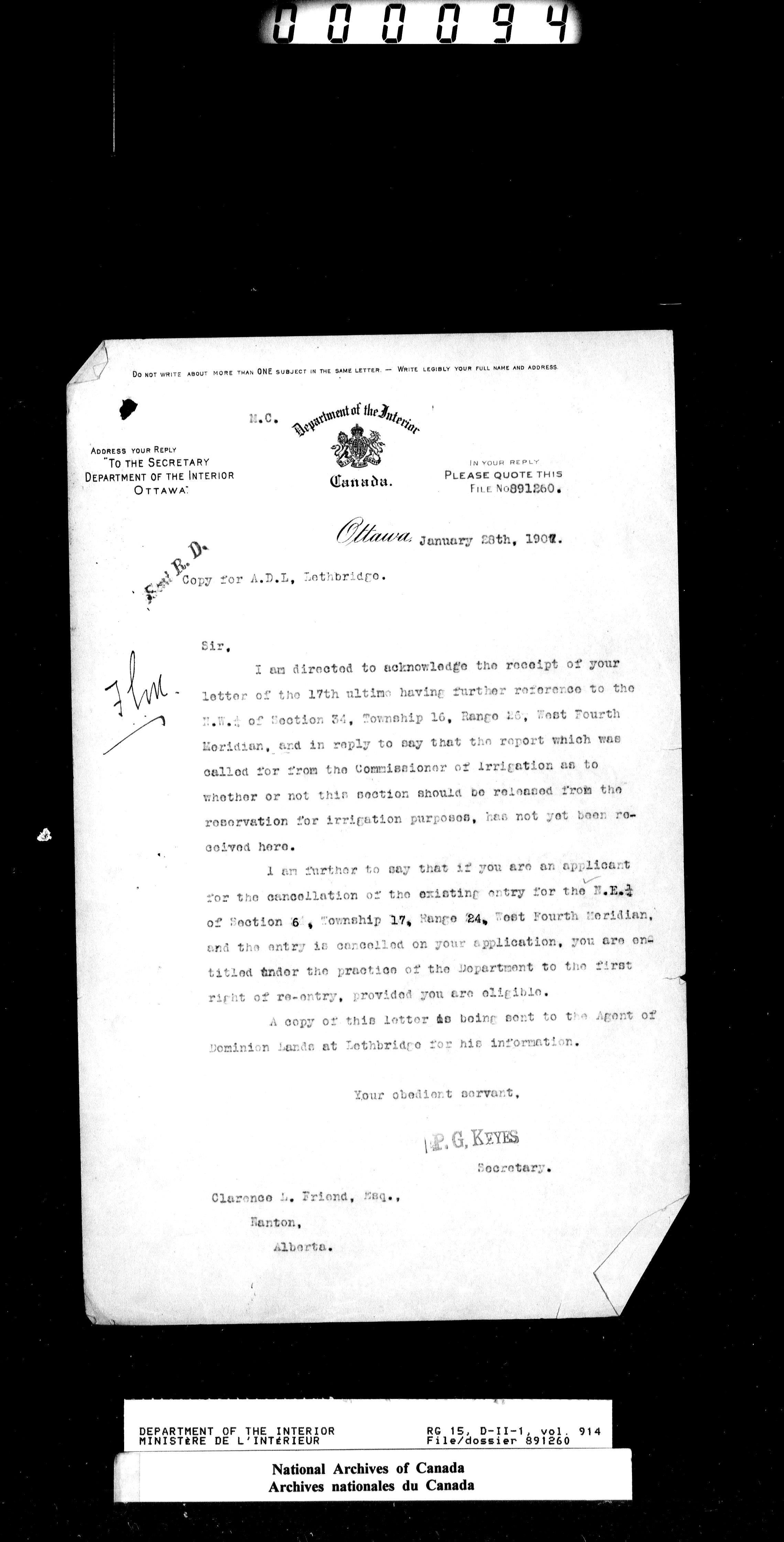 Dominion Lands Branch - Correspondence Files - 14522