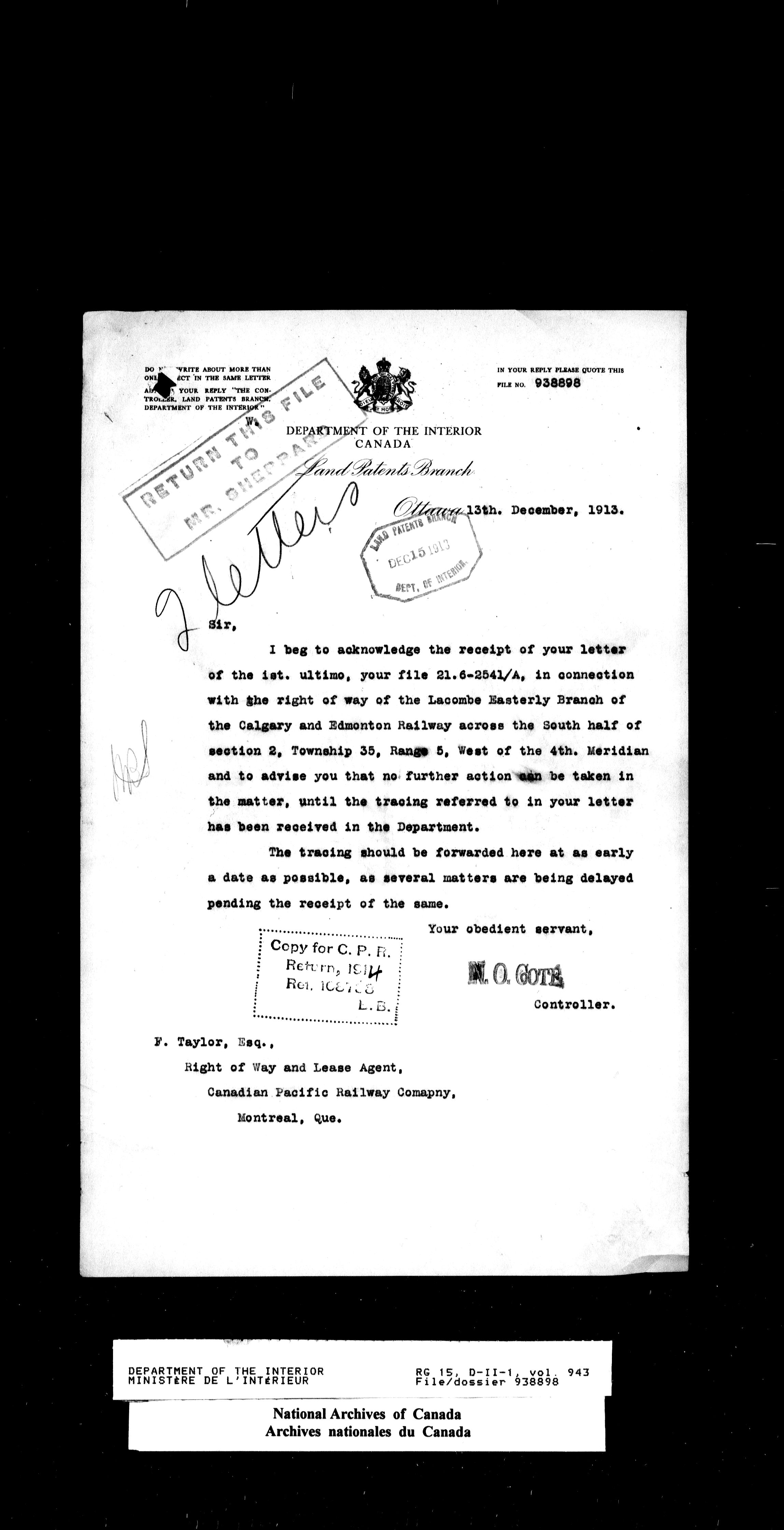 Dominion Lands Branch - Correspondence Files - 14534