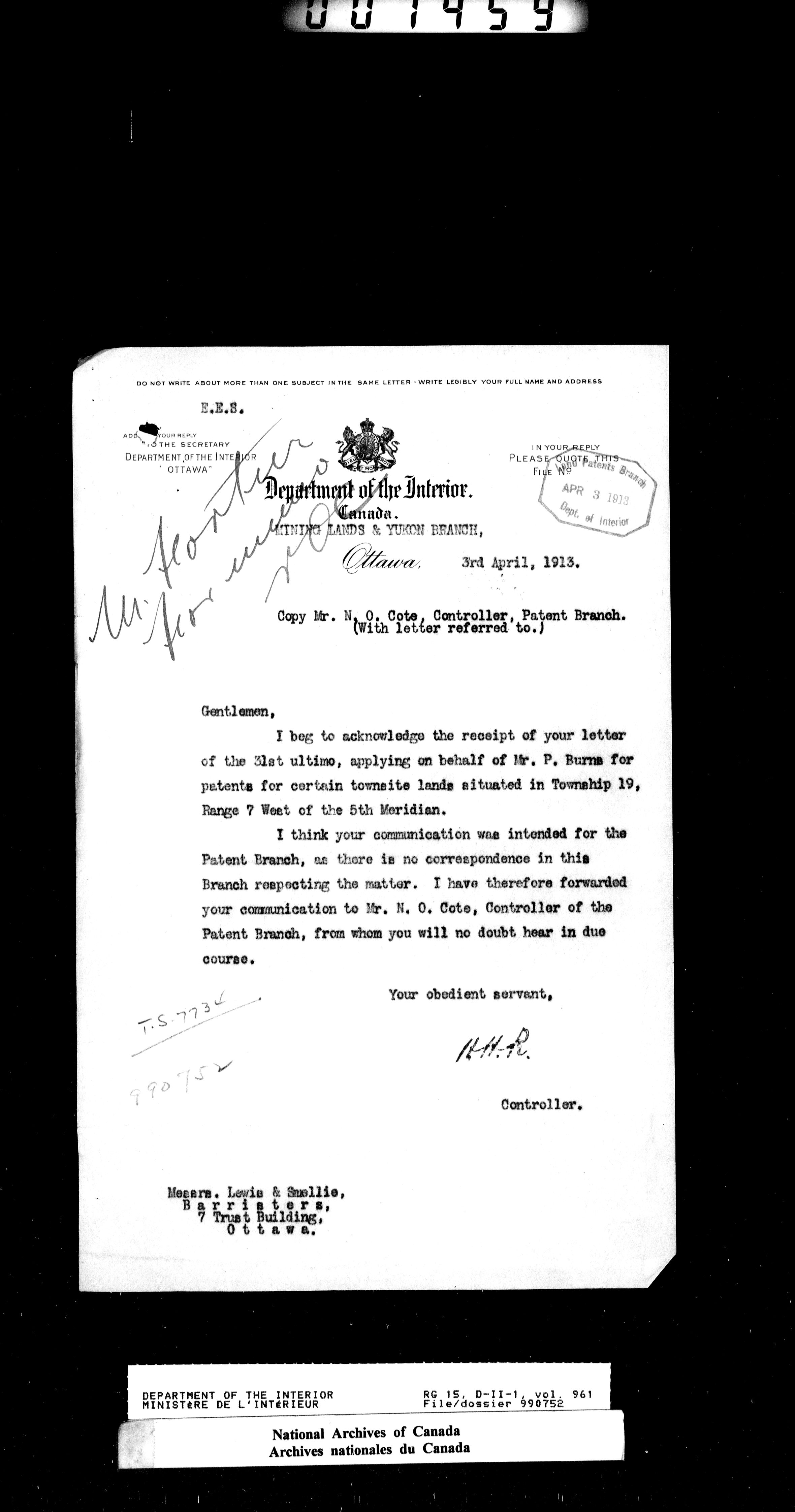 Dominion Lands Branch - Correspondence Files - 14545