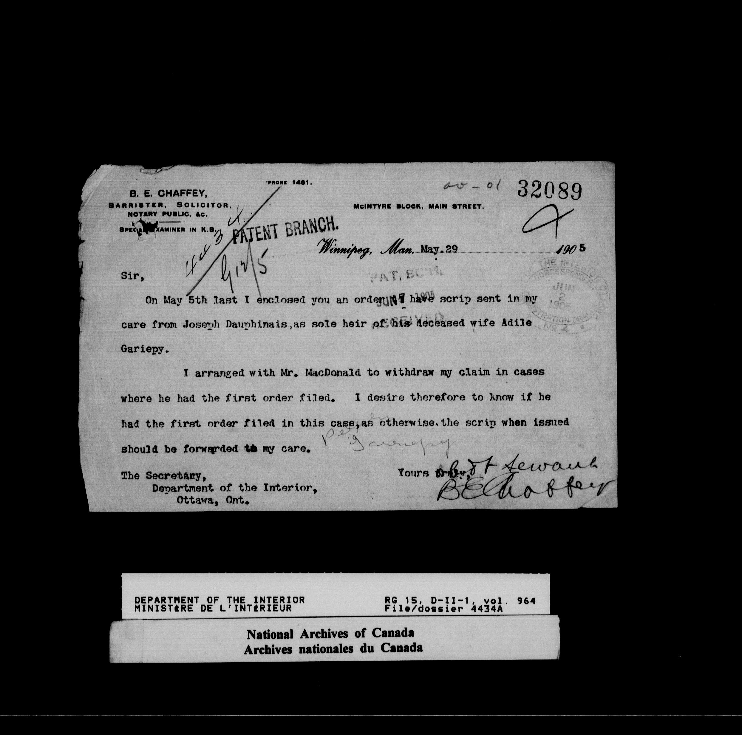 Dominion Lands Branch : Correspondence files : T-14547
