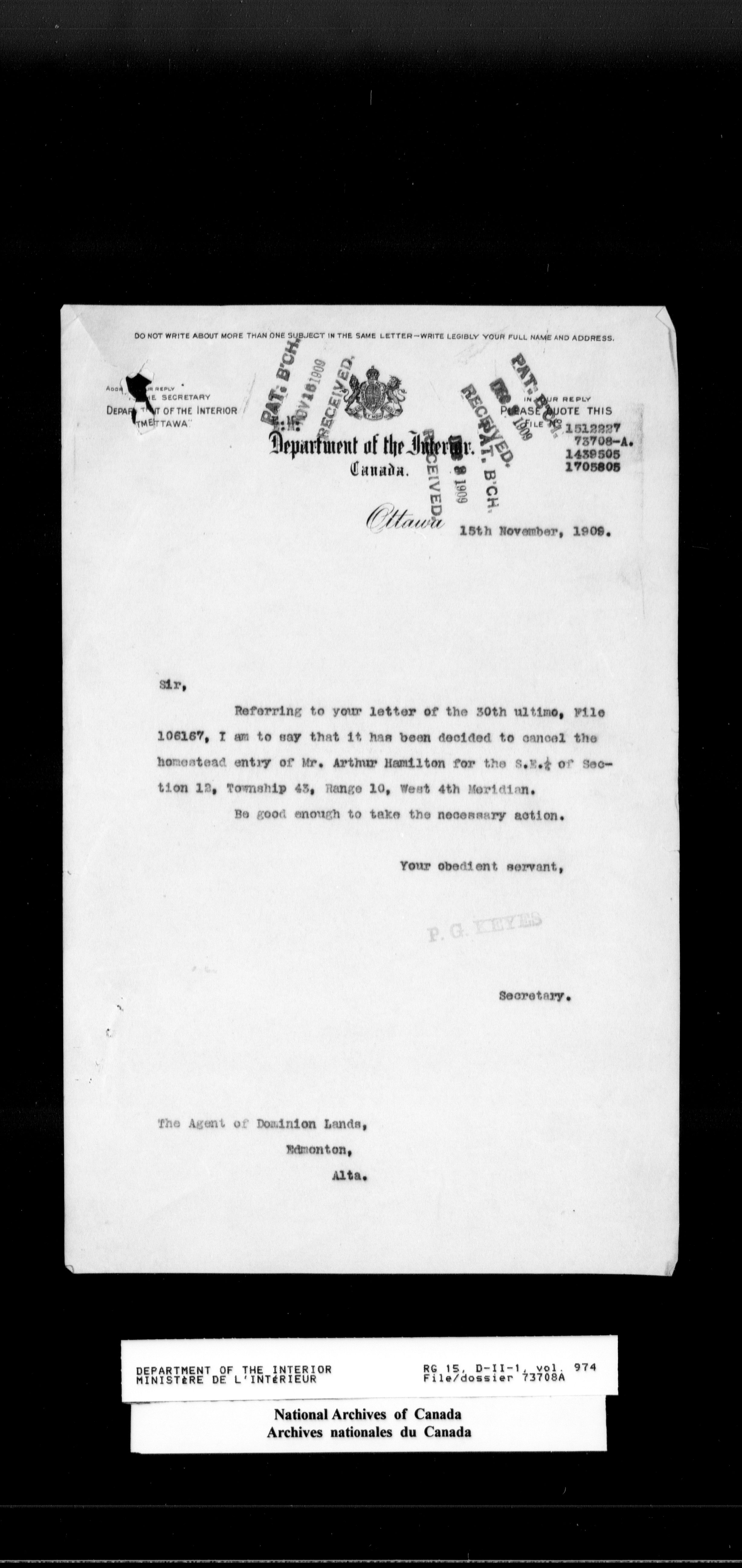 Dominion Lands Branch - Correspondence Files - 14555