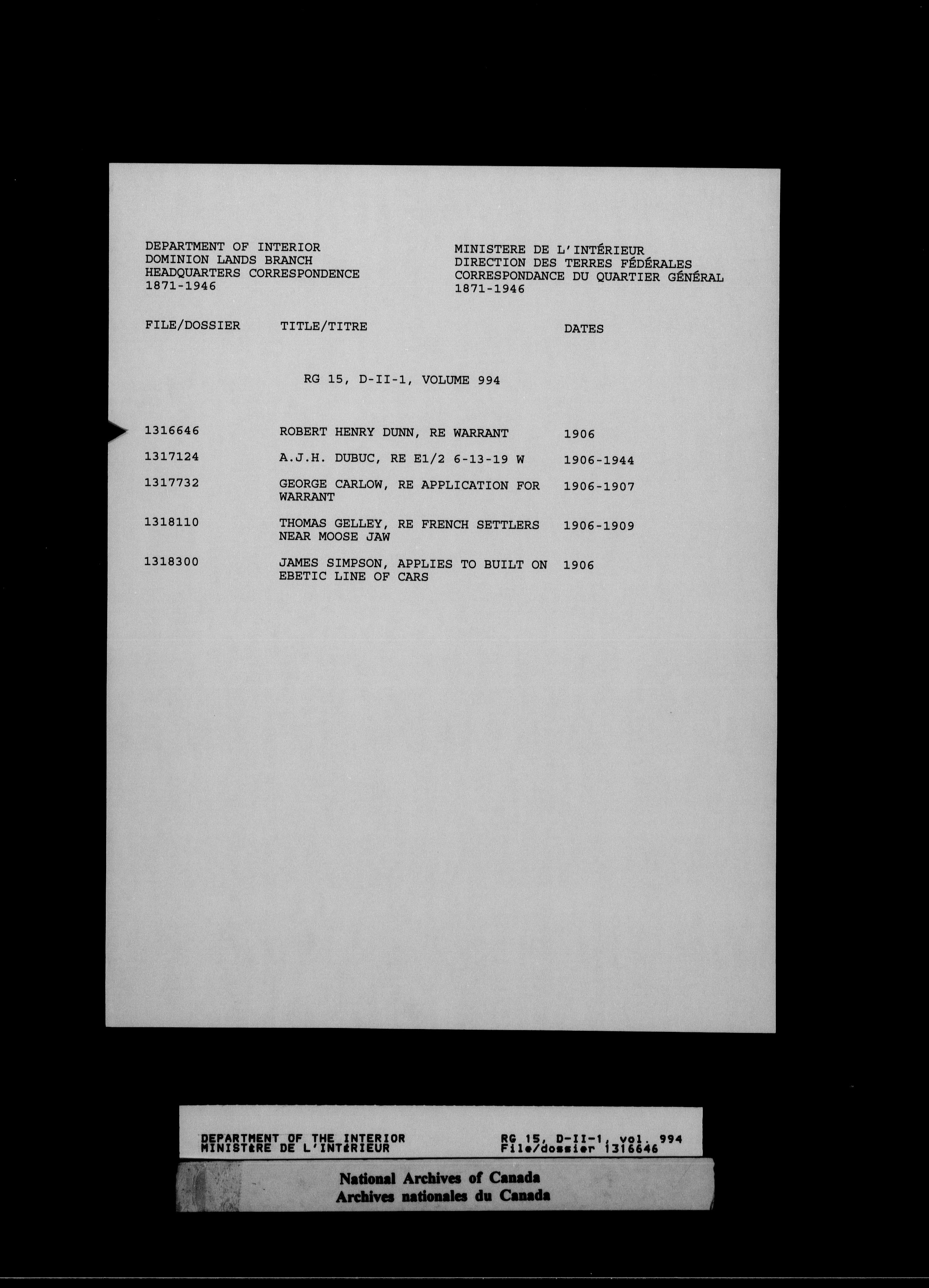 Dominion Lands Branch : Correspondence files : T-14574