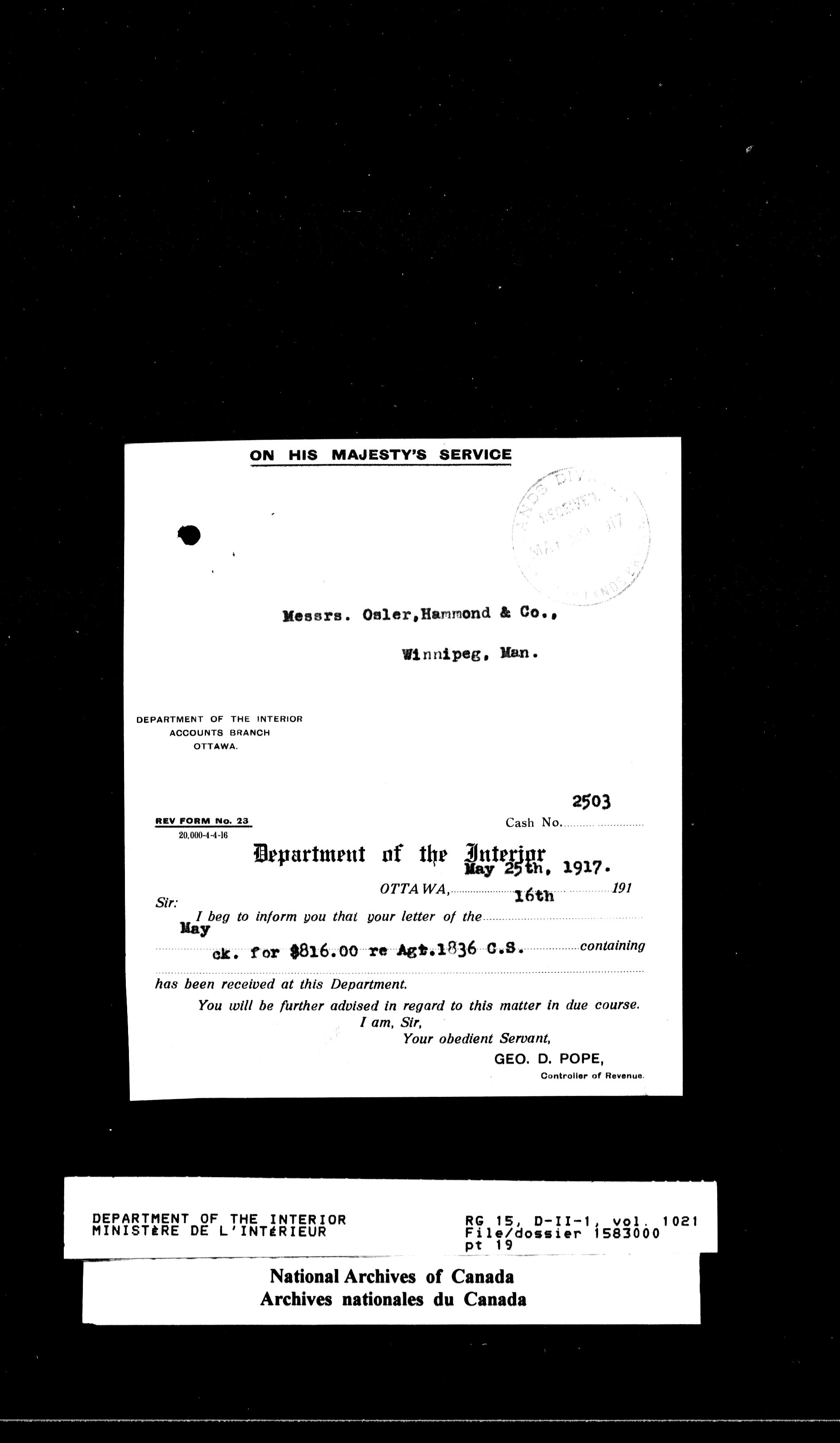 Dominion Lands Branch : Correspondence files : T-14598