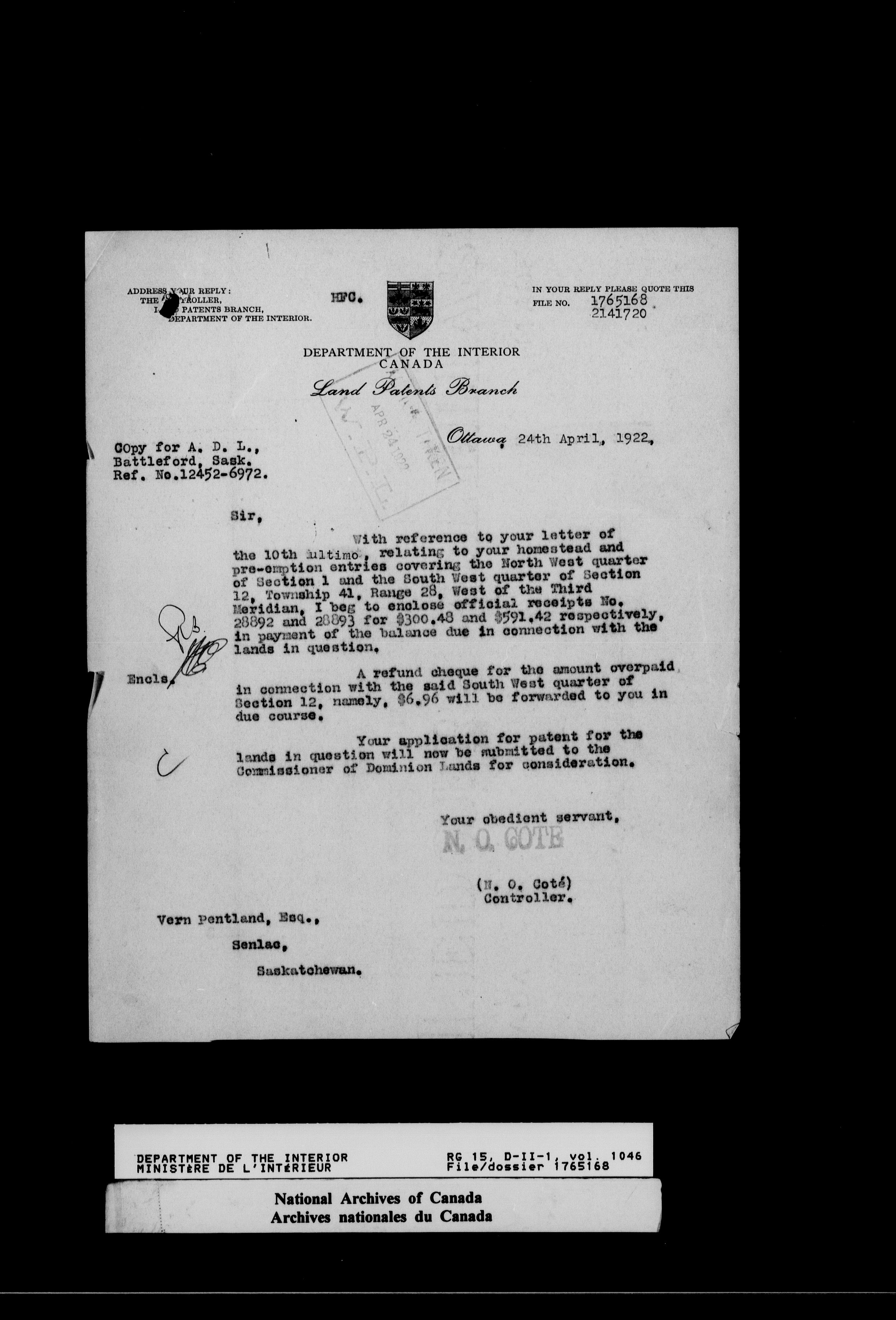 Dominion Lands Branch - Correspondence Files - 14617