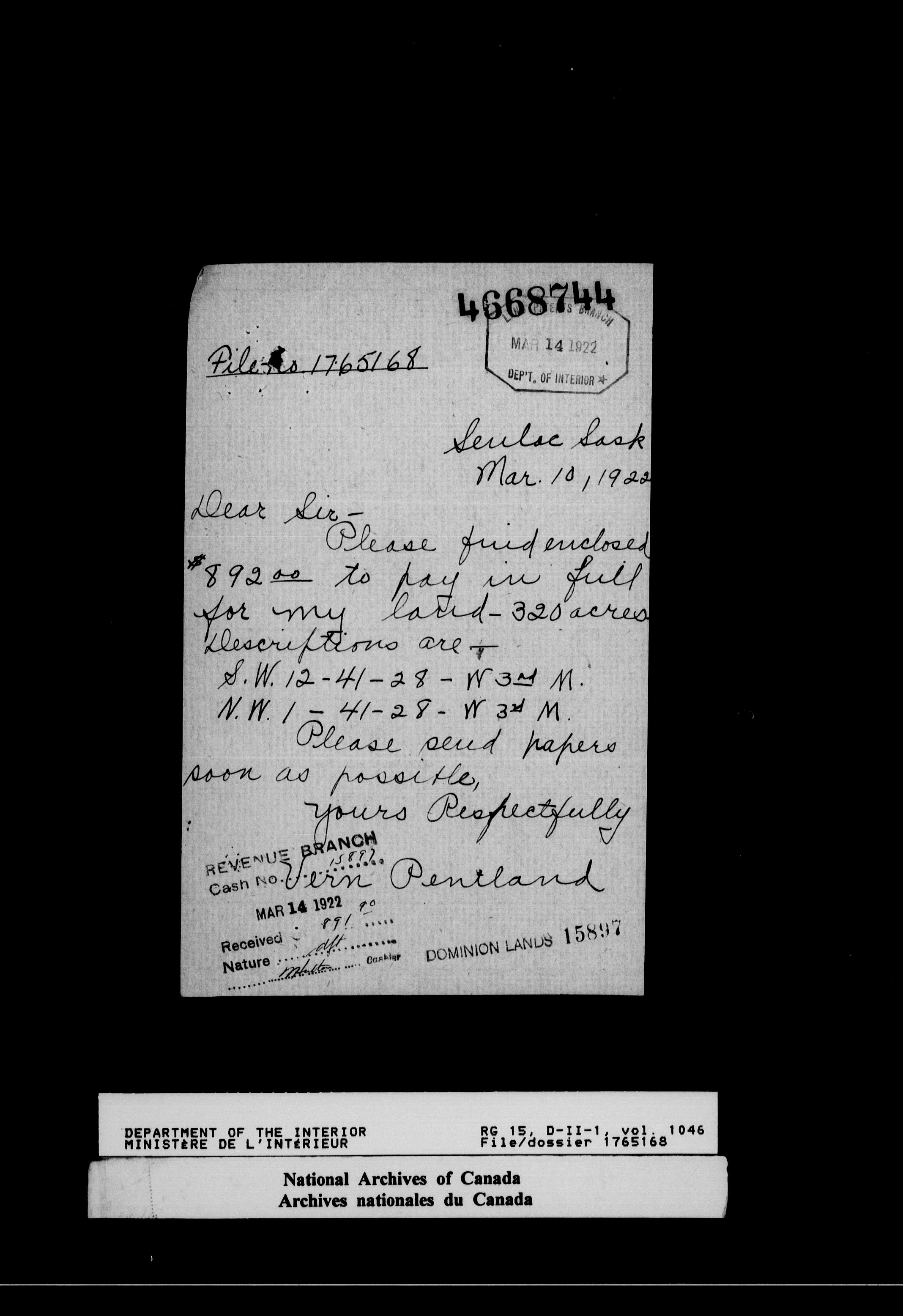 Dominion Lands Branch - Correspondence Files - 14617