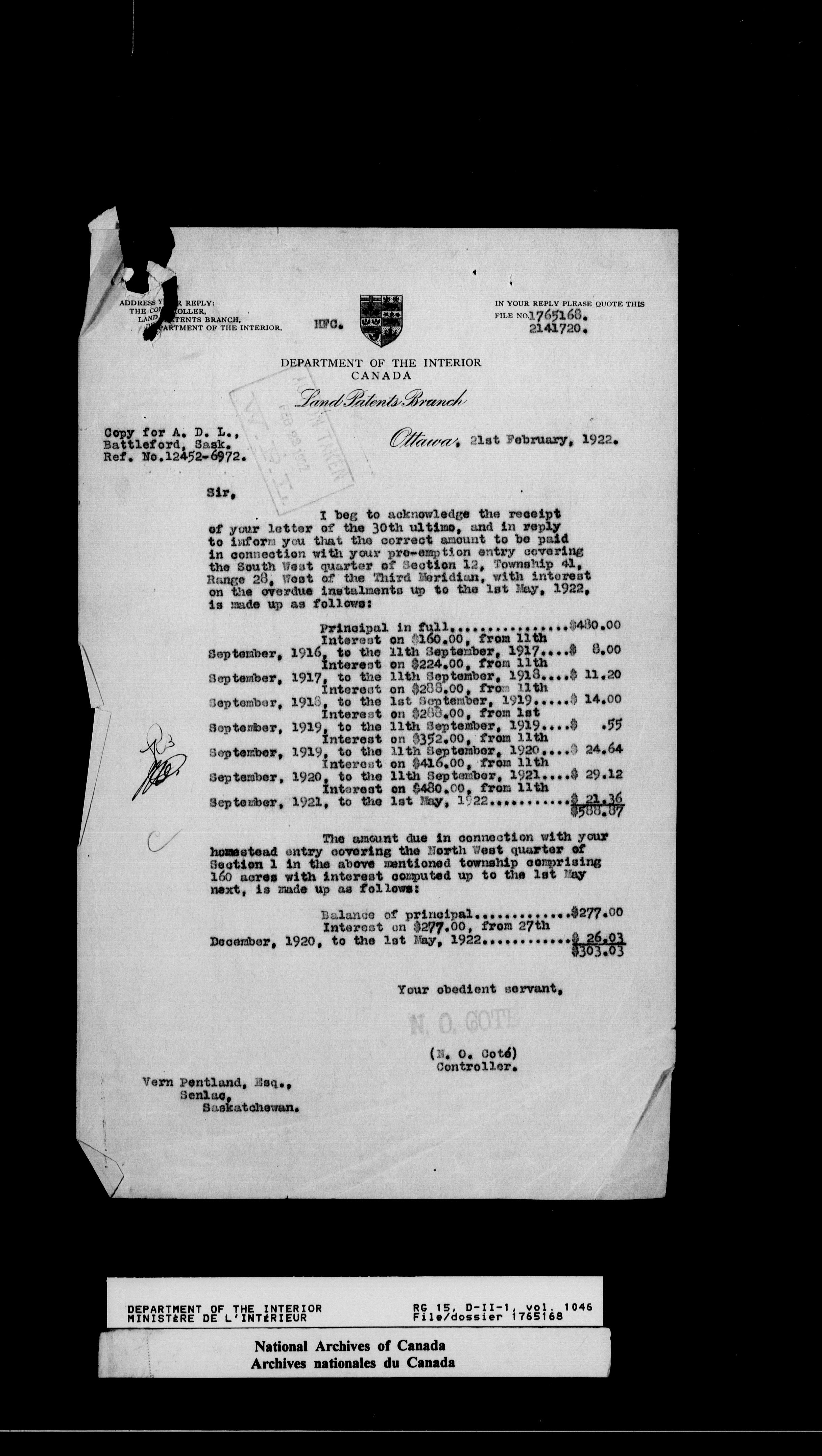 Dominion Lands Branch - Correspondence Files - 14617