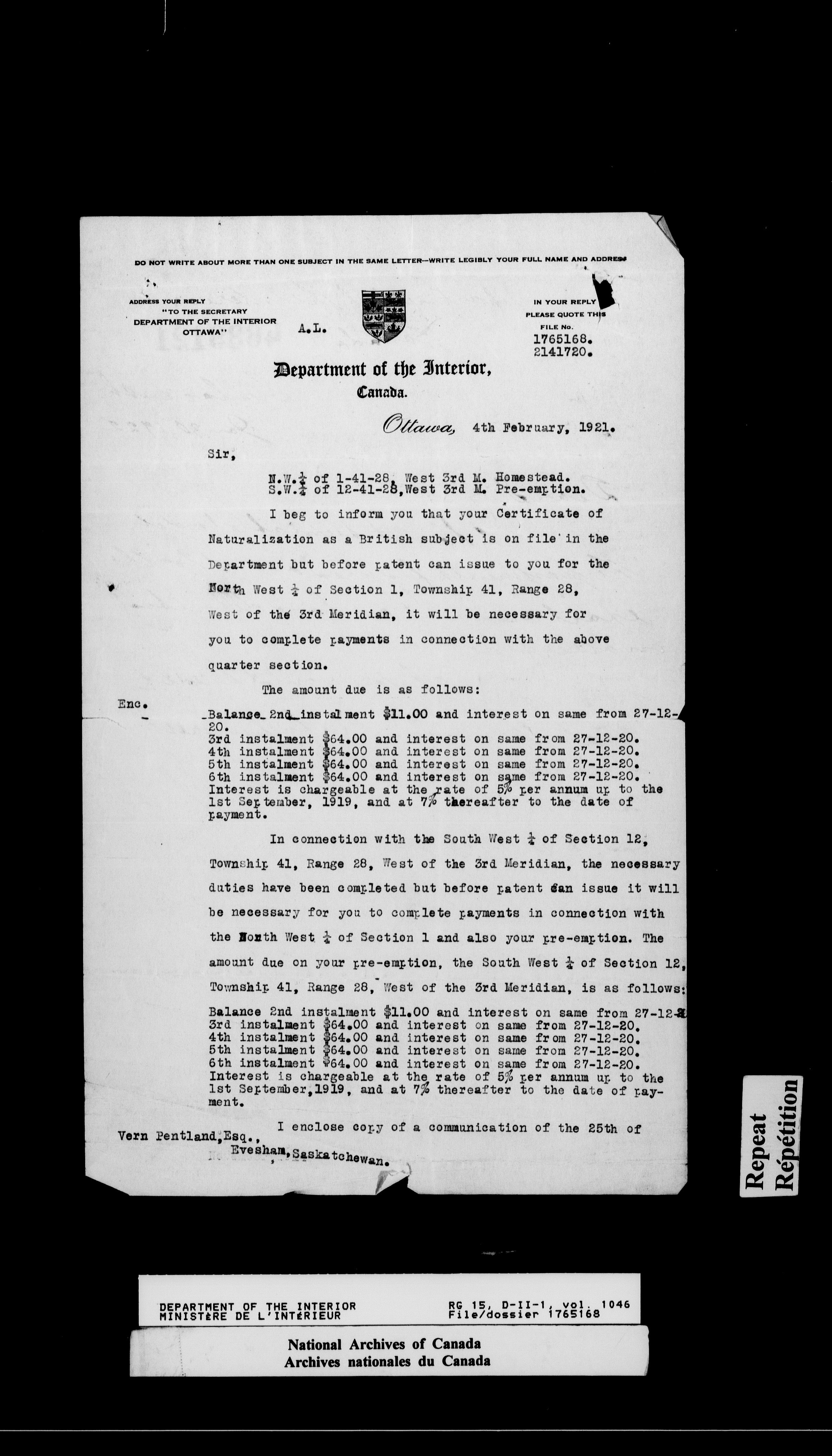 Dominion Lands Branch - Correspondence Files - 14617