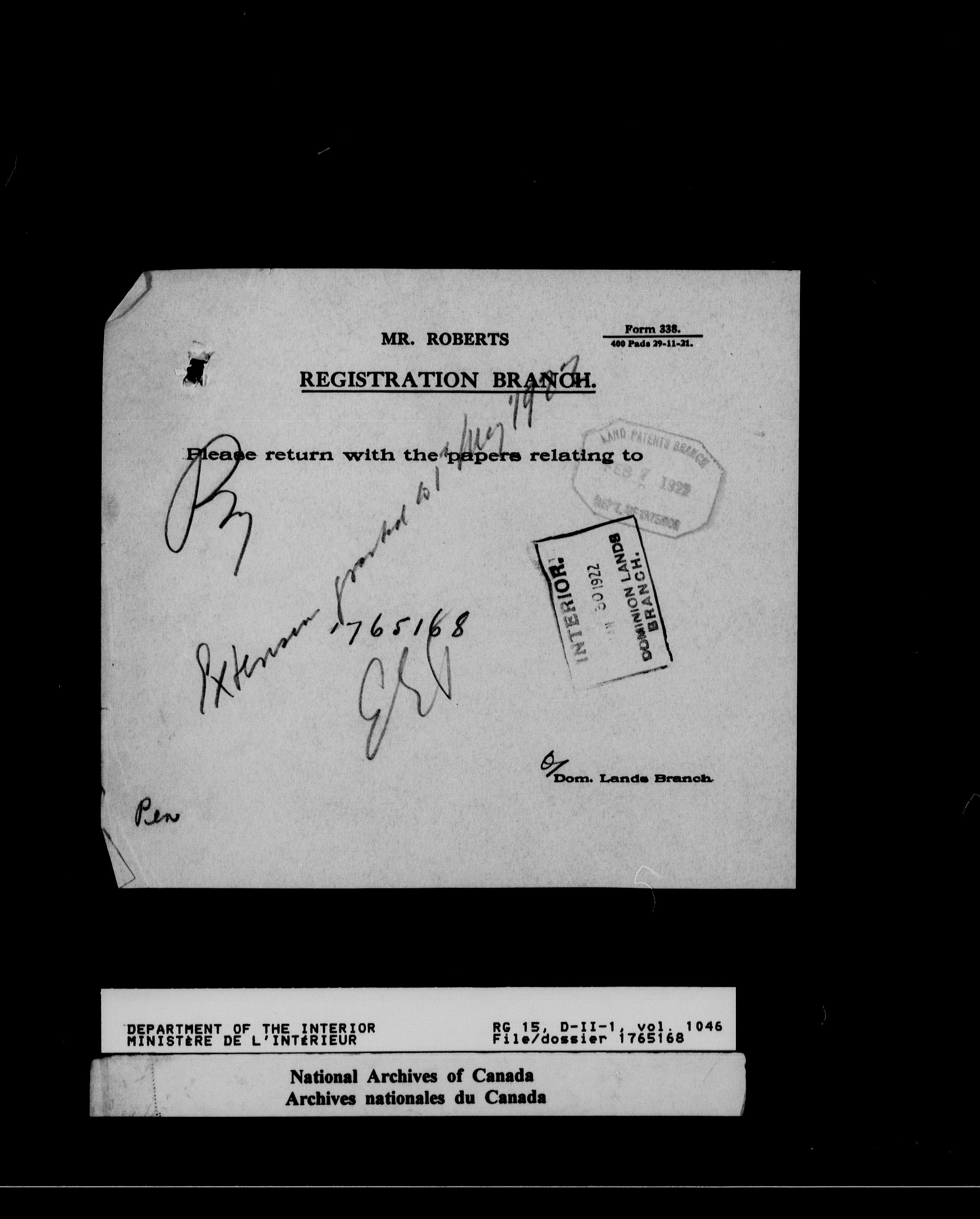 Dominion Lands Branch - Correspondence Files - 14617