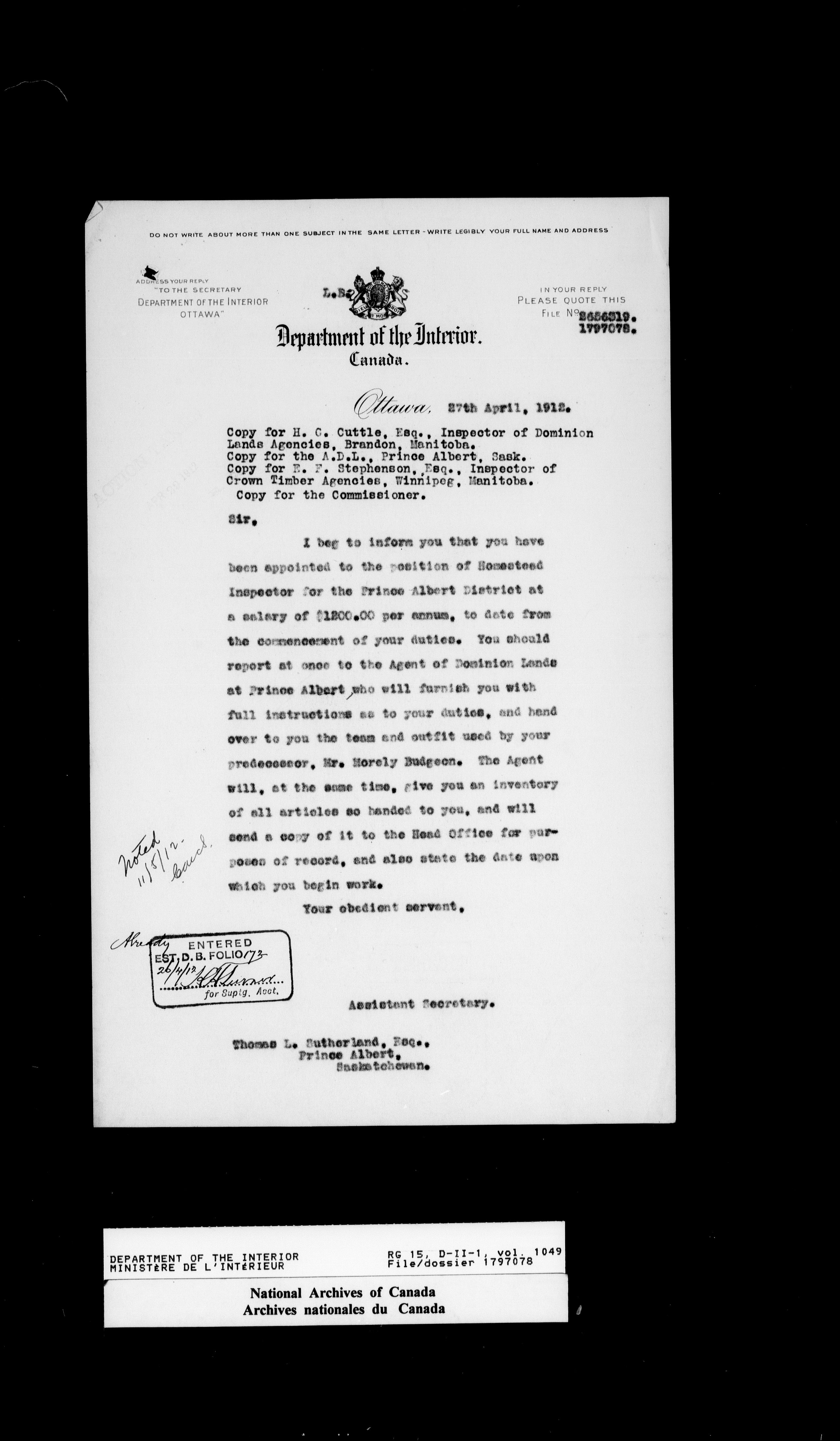Central registry subject files created by the Dominion Lands Branch - 14620