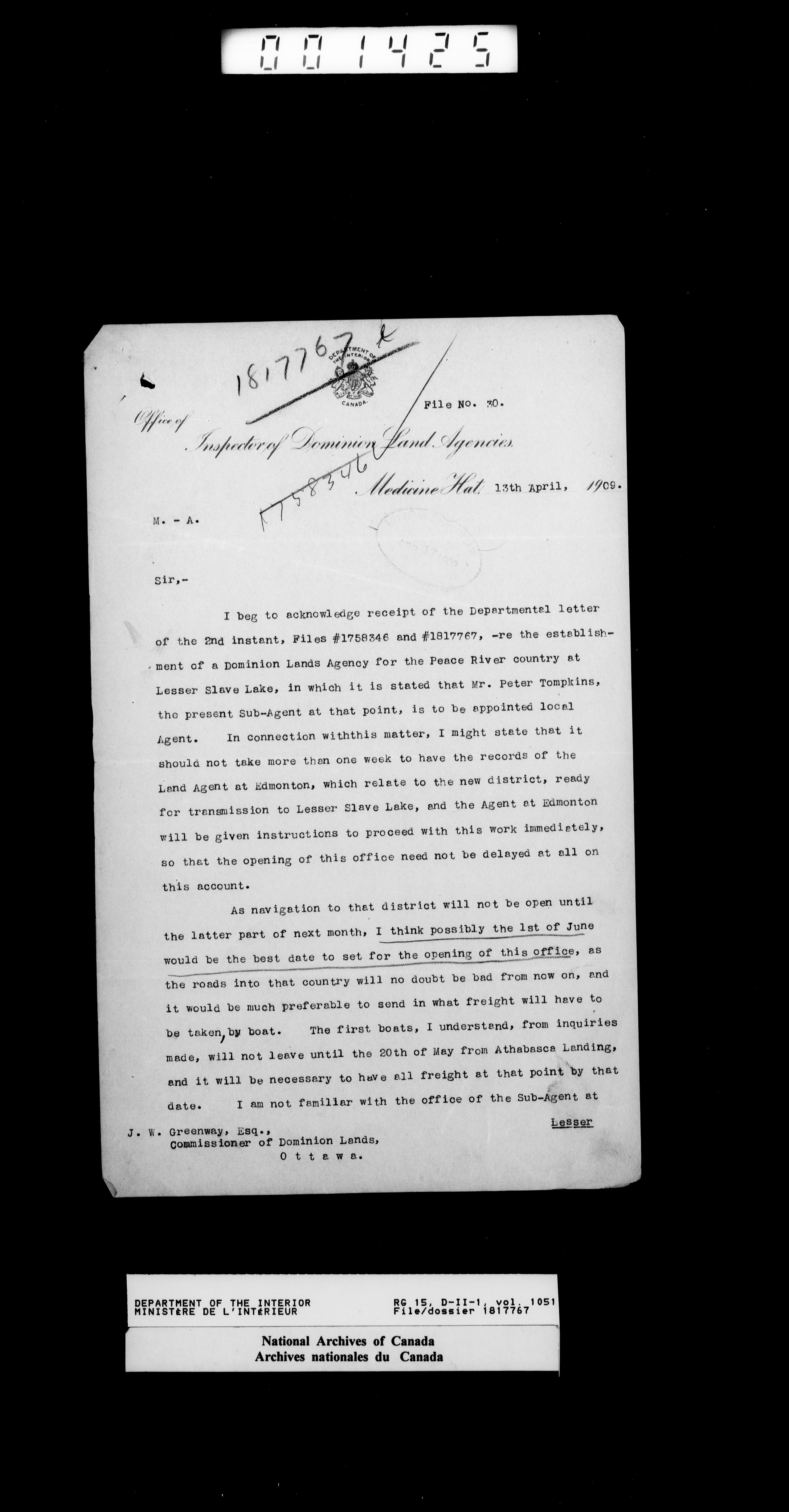 Central registry subject files created by the Dominion Lands Branch - 14621