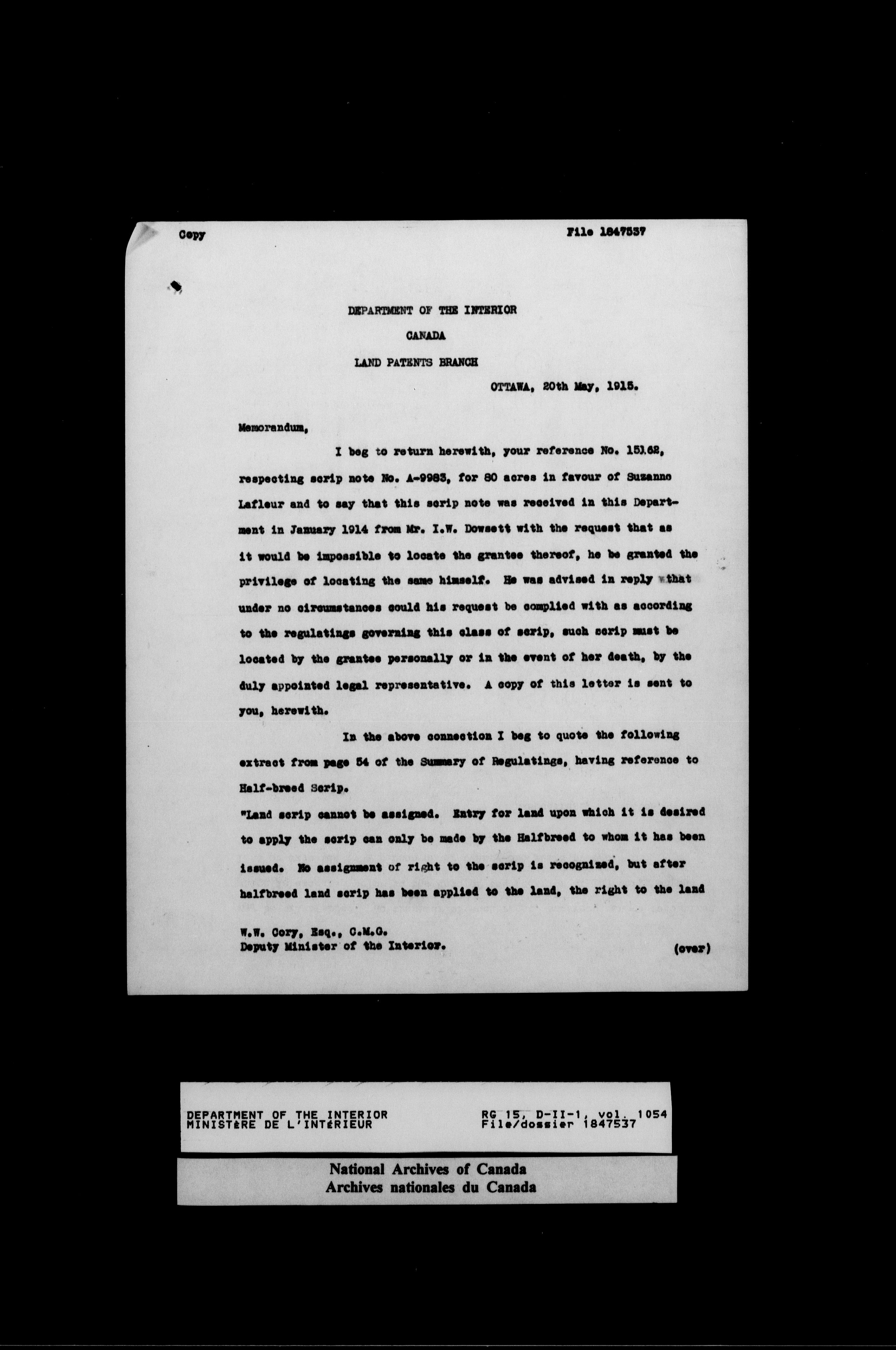Central registry subject files created by the Dominion Lands Branch - 14624