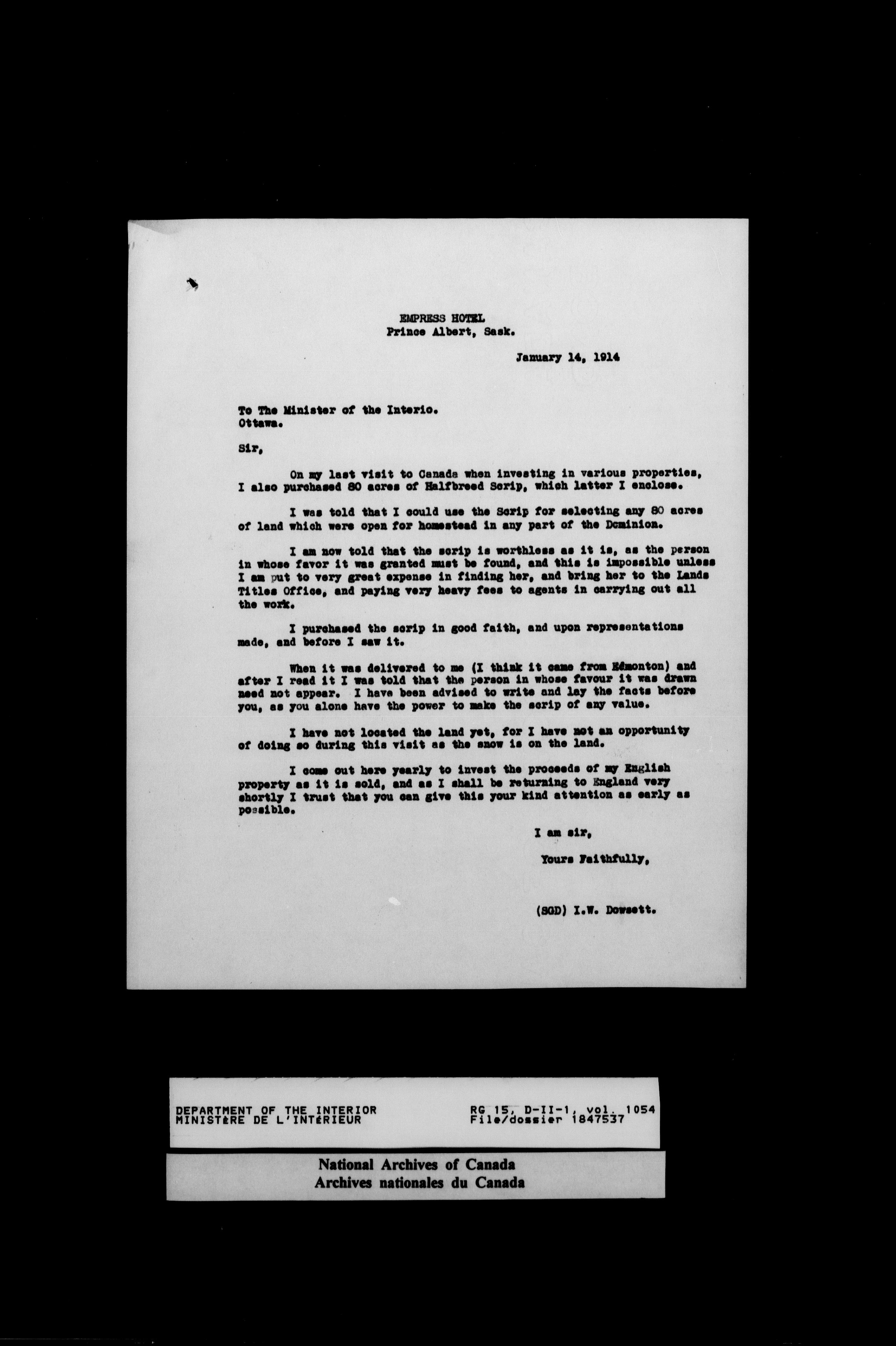 Central registry subject files created by the Dominion Lands Branch - 14624