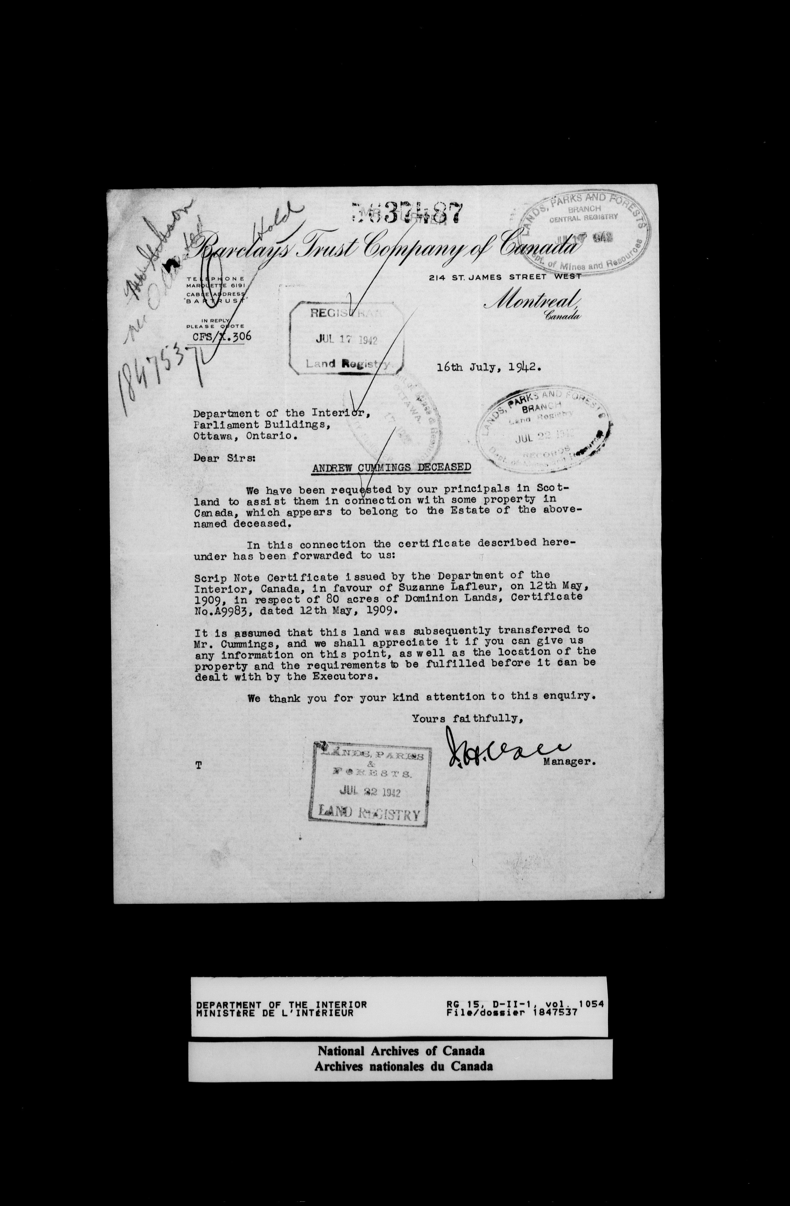 Central registry subject files created by the Dominion Lands Branch - 14624