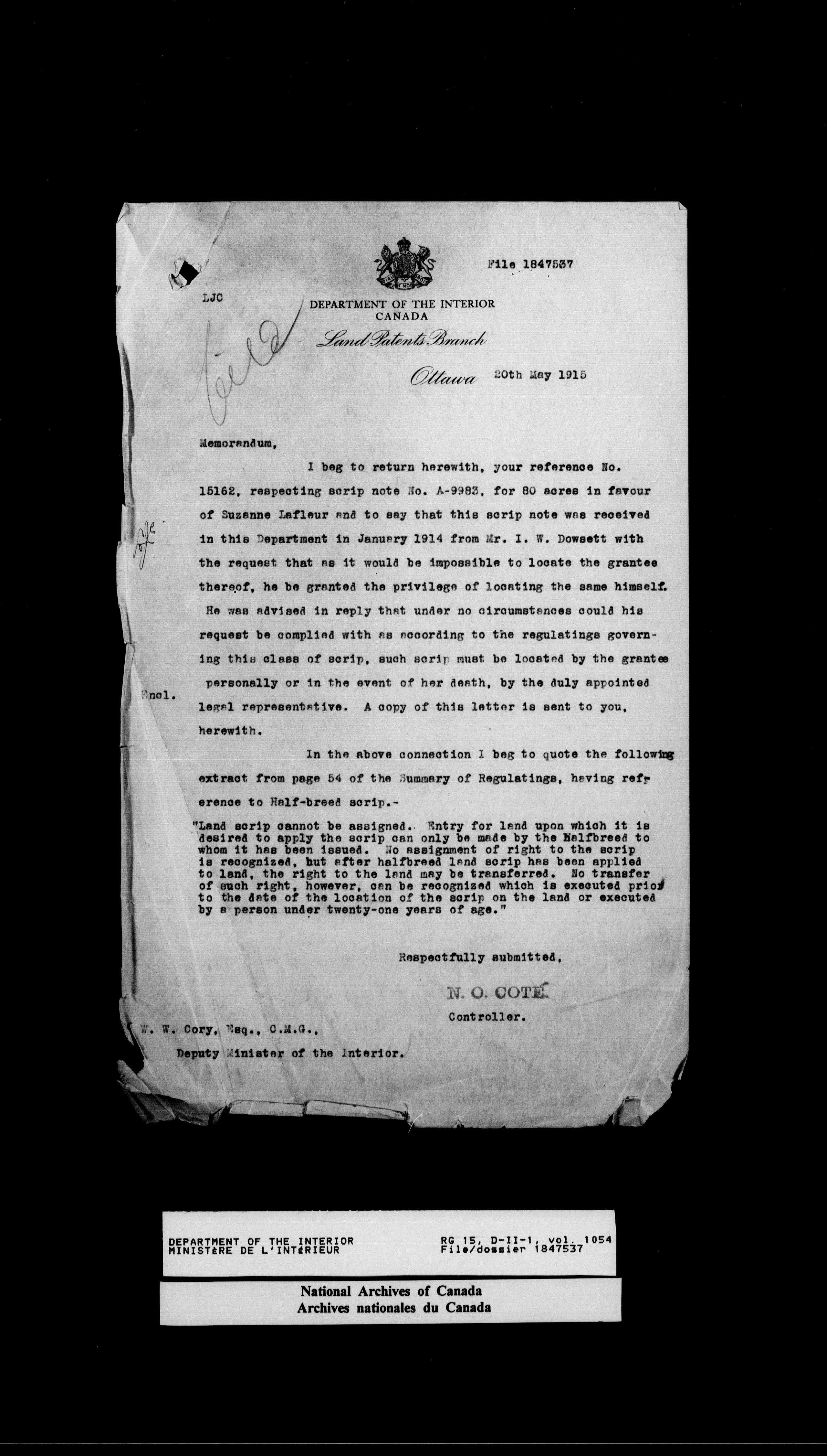 Central registry subject files created by the Dominion Lands Branch - 14624