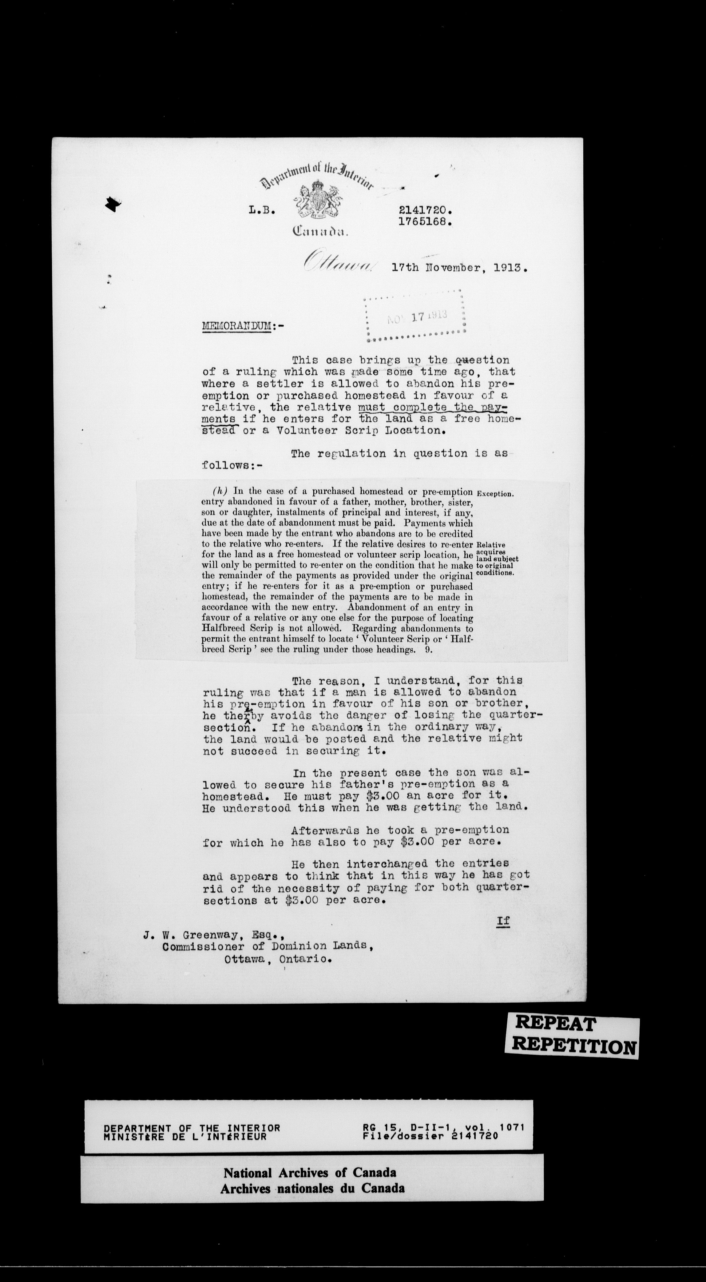 Central registry subject files created by the Dominion Lands Branch - 14637