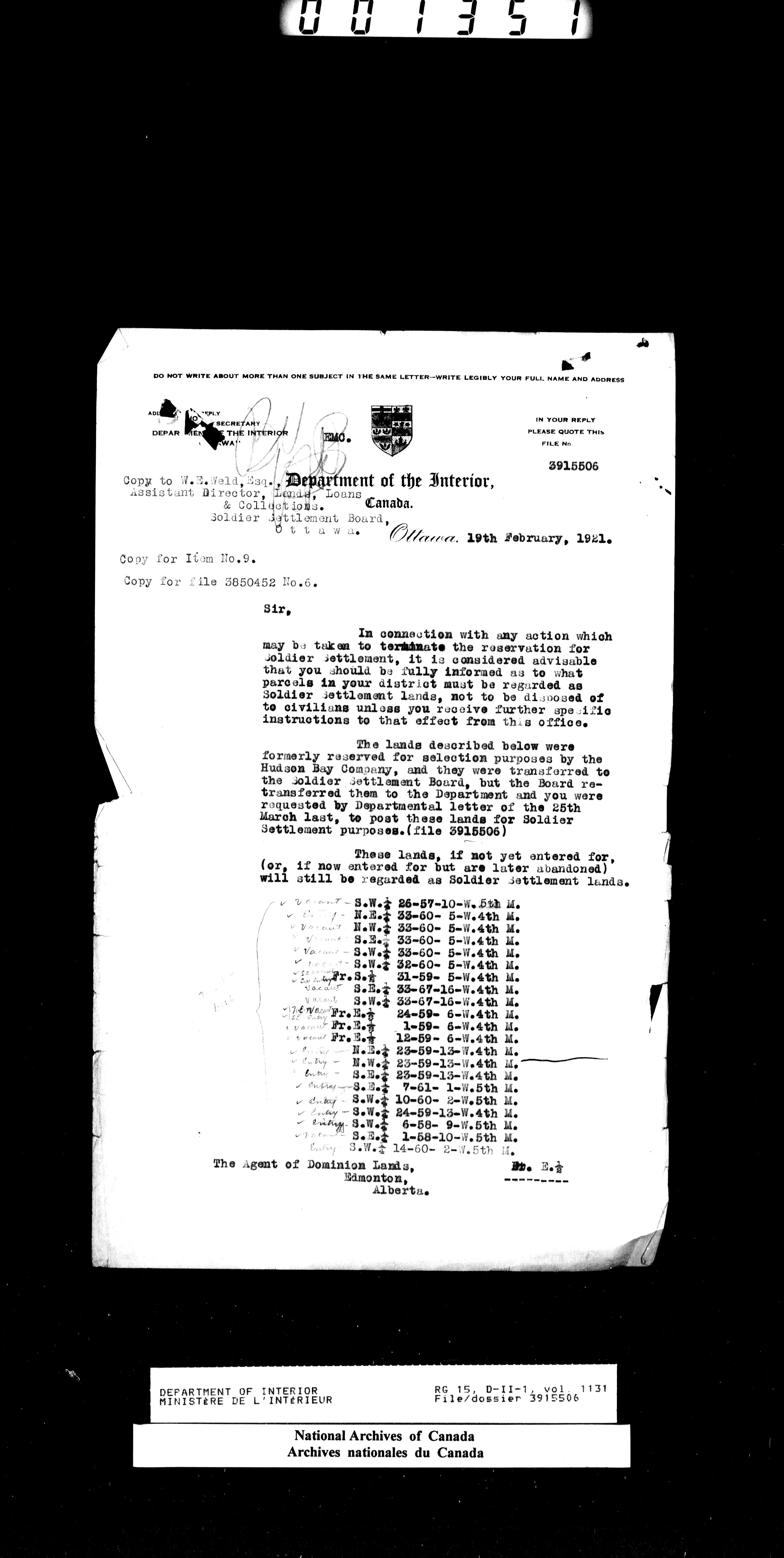 Central registry subject files created by the Dominion Lands Branch - 14691