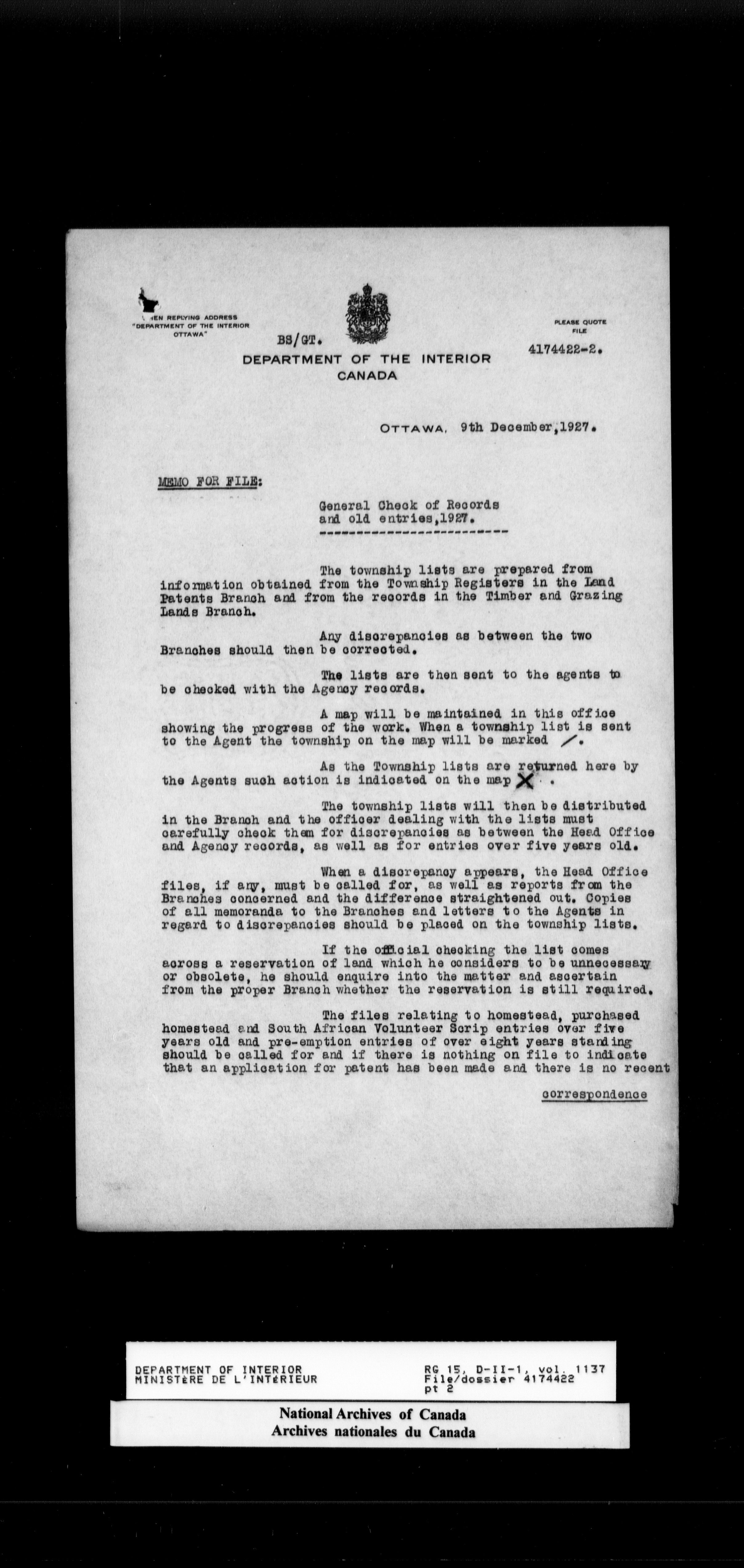 Central registry subject files created by the Dominion Lands Branch - 14697