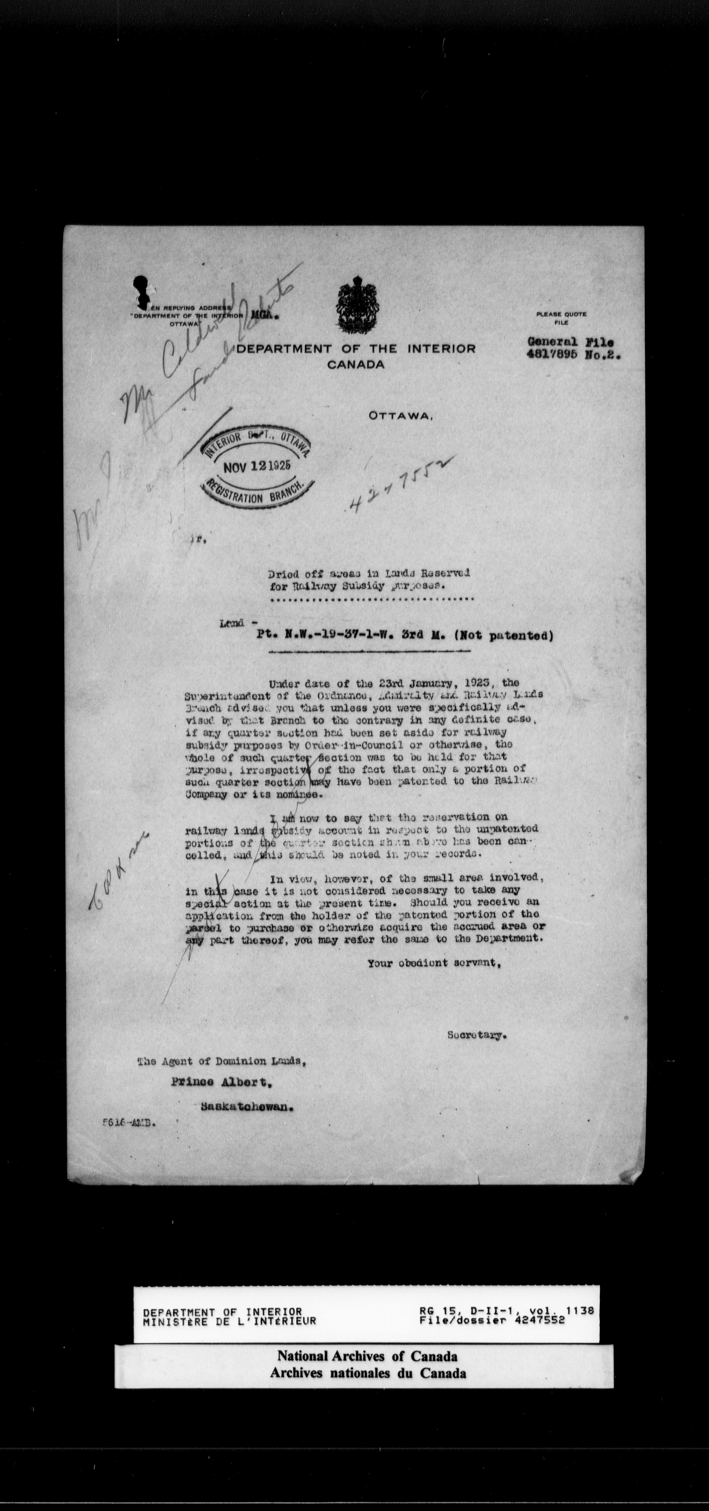 Central registry subject files created by the Dominion Lands Branch - 14698