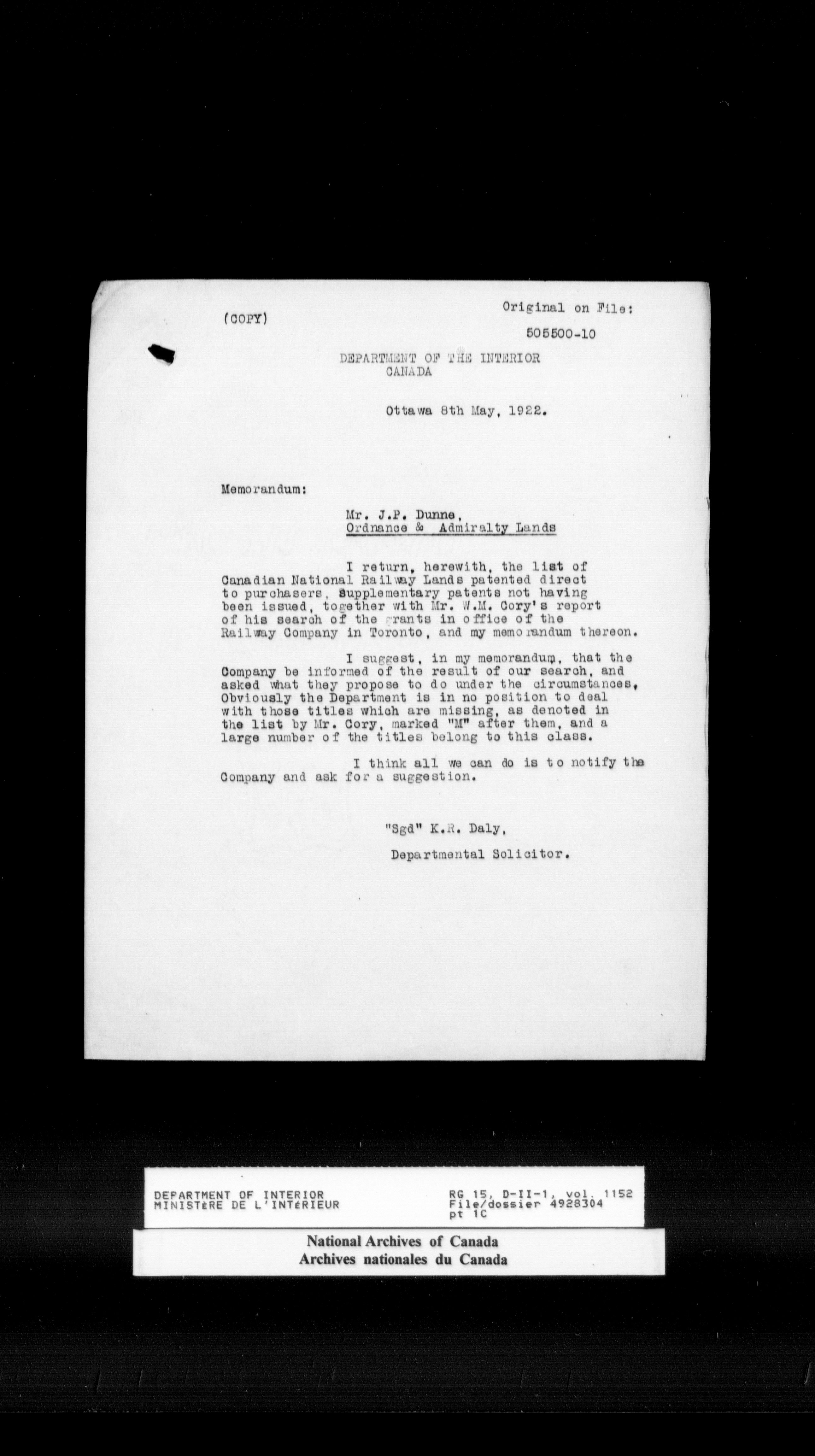 Central registry subject files created by the Dominion Lands Branch - 15520