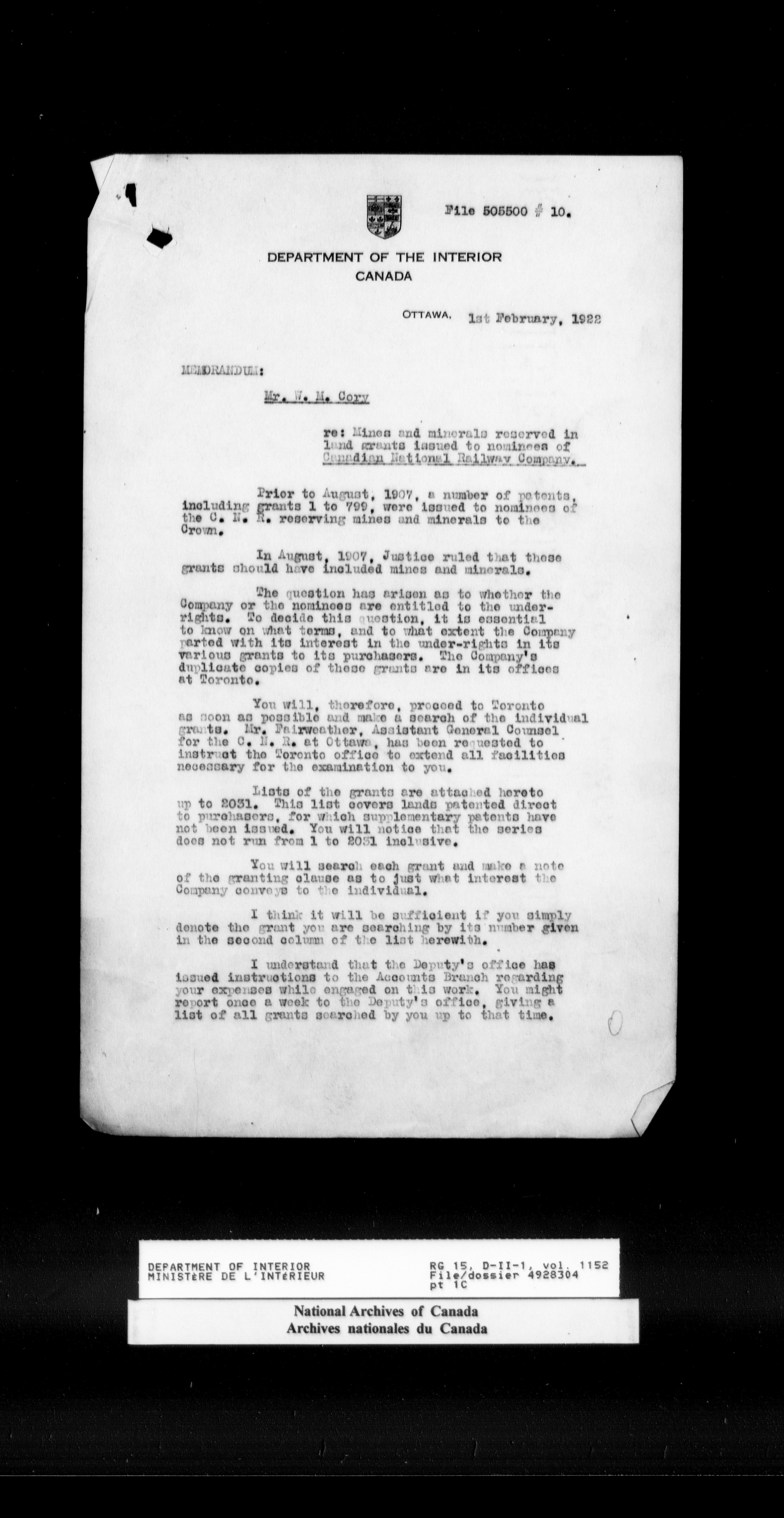 Central registry subject files created by the Dominion Lands Branch - 15520