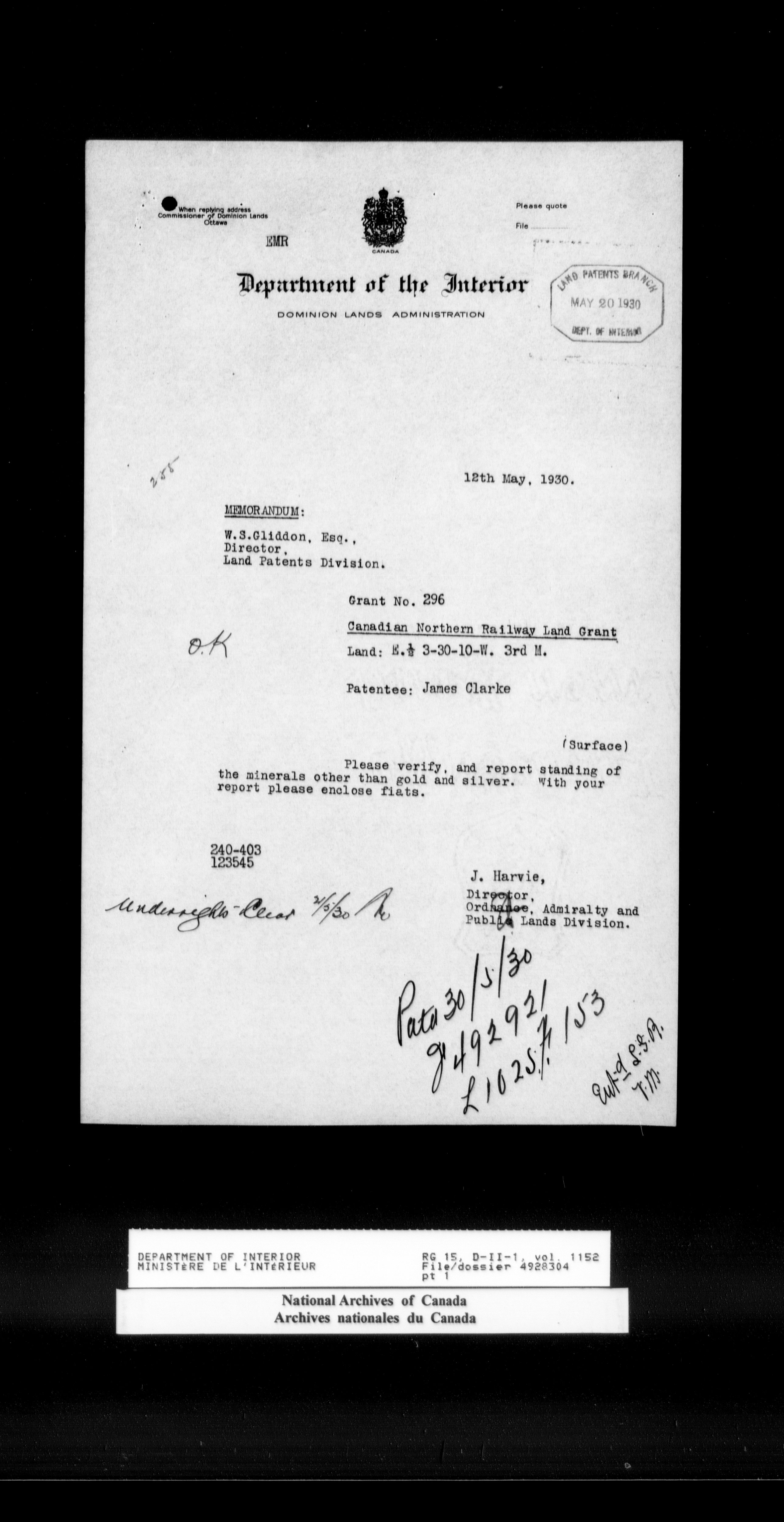 Central registry subject files created by the Dominion Lands Branch - 15520