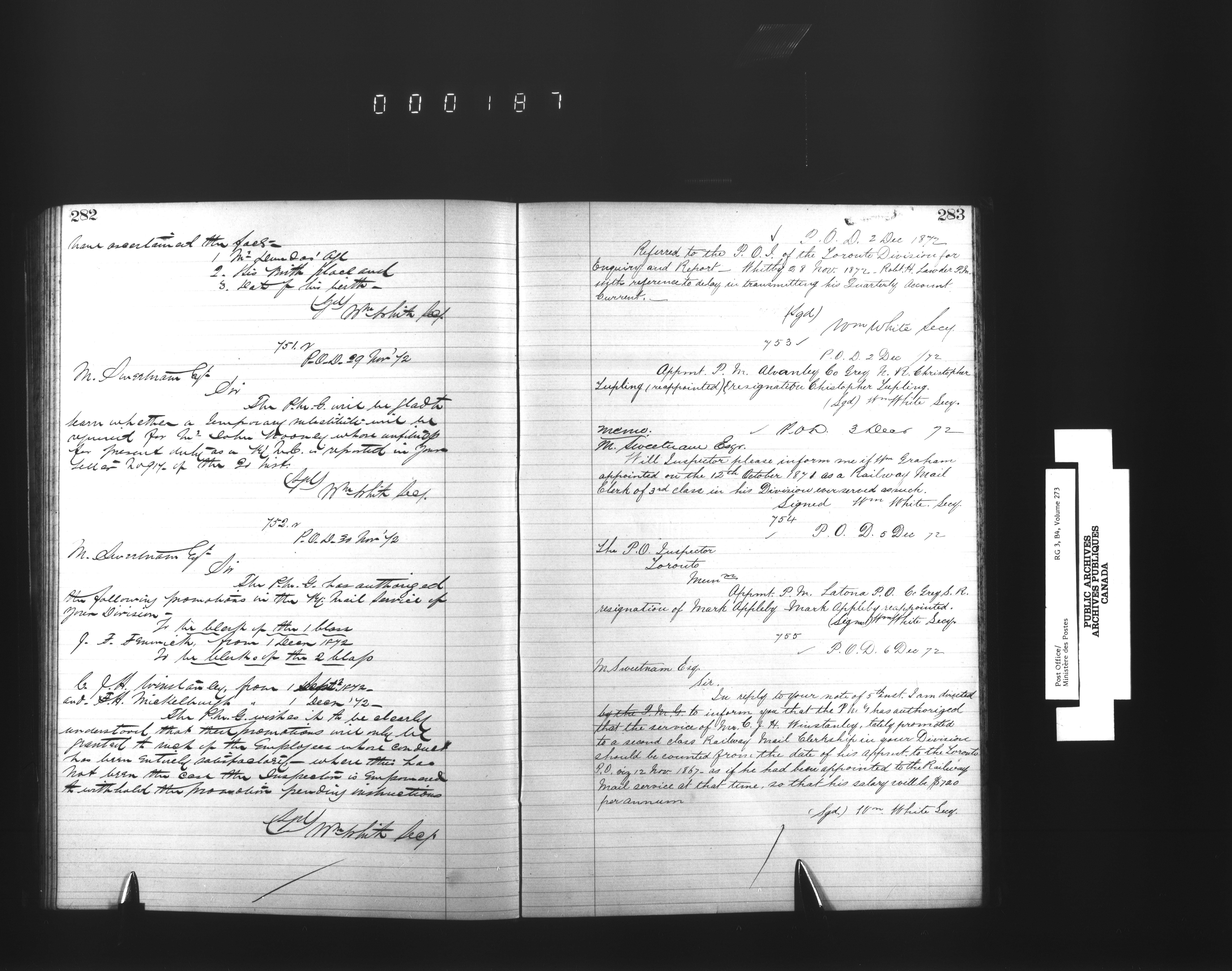 Deputy Postmaster General : correspondence addressed to the Post Office Inspectors, 1851-1902 : T-1587