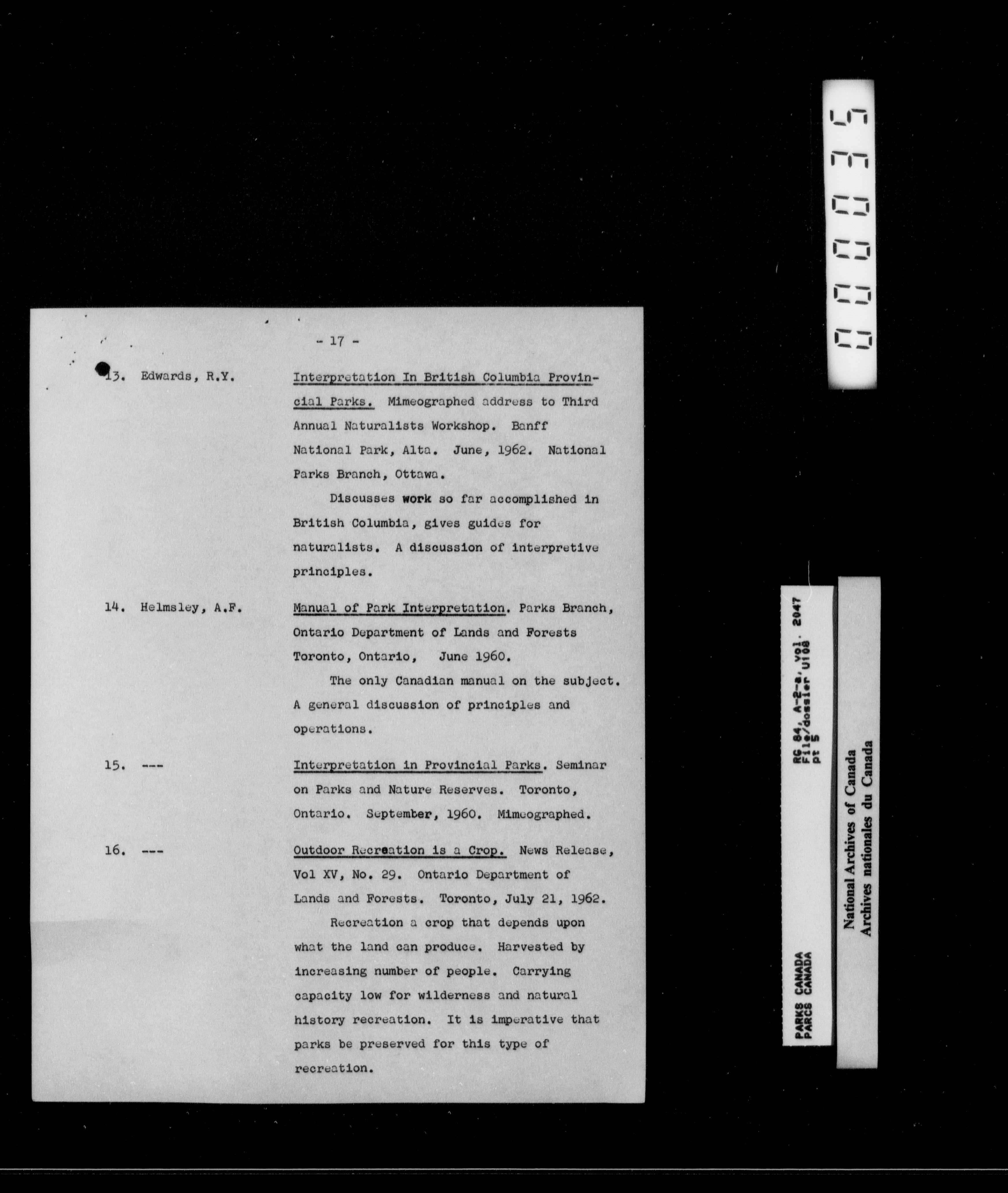 Department of Canadian Heritage, Canadian Parks Service : Park/subject classification system - 16009