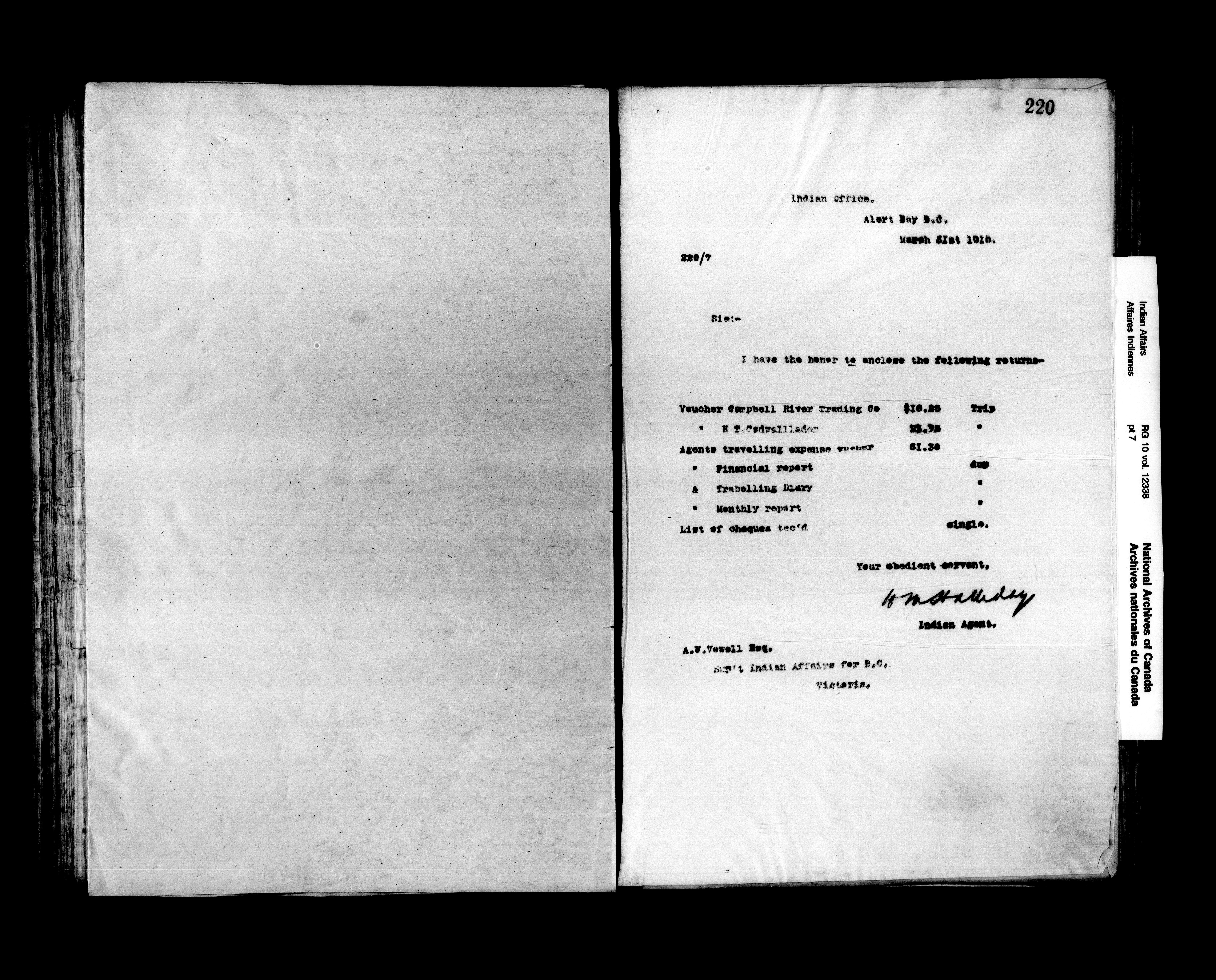 Letters written by the agent at Alert Bay (Kwawkewlth) Agency between 1908 and 1913 and between 1914 and 1920. - 16072