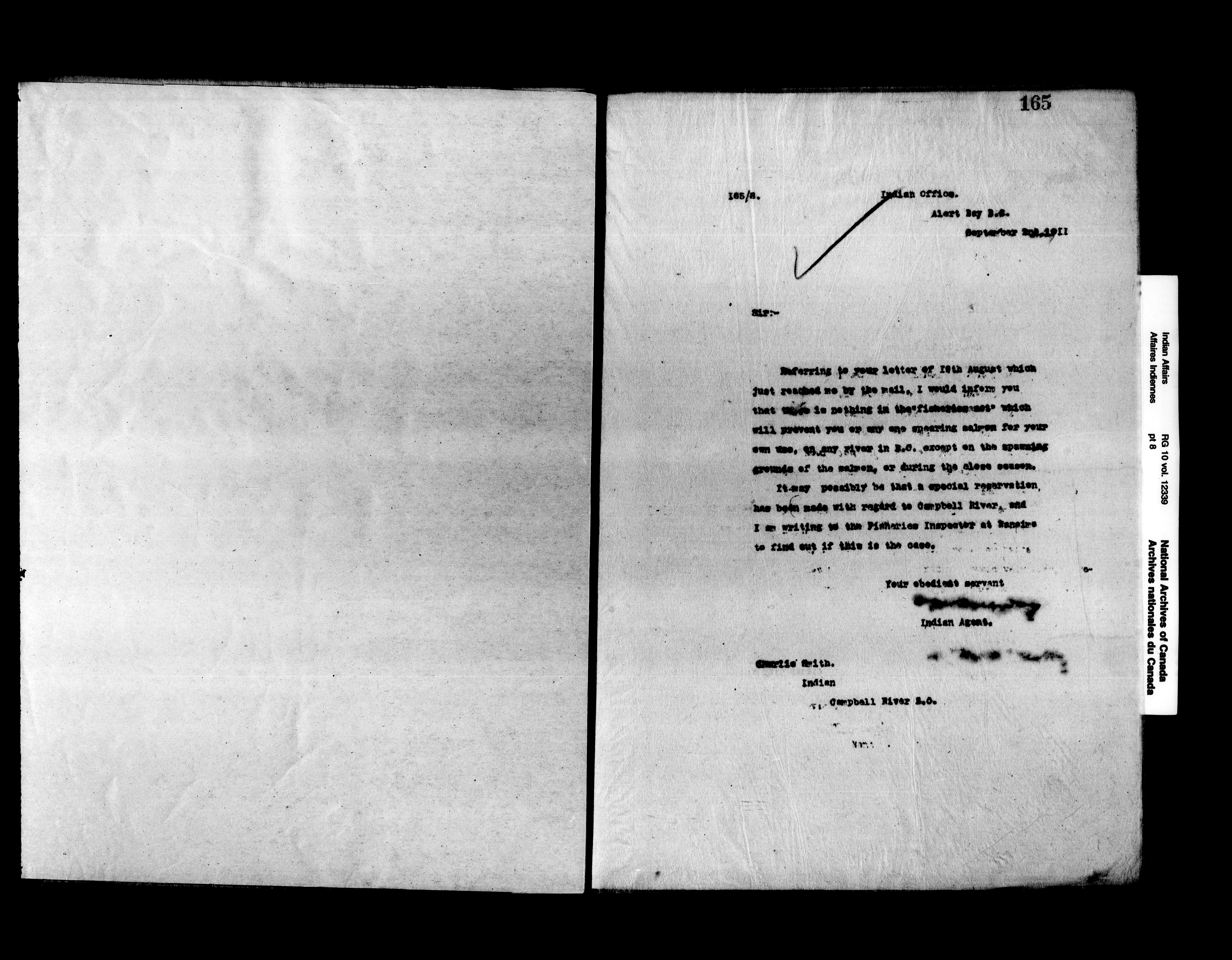 Letters written by the agent at Alert Bay (Kwawkewlth) Agency between 1908 and 1913 and between 1914 and 1920. - 16073
