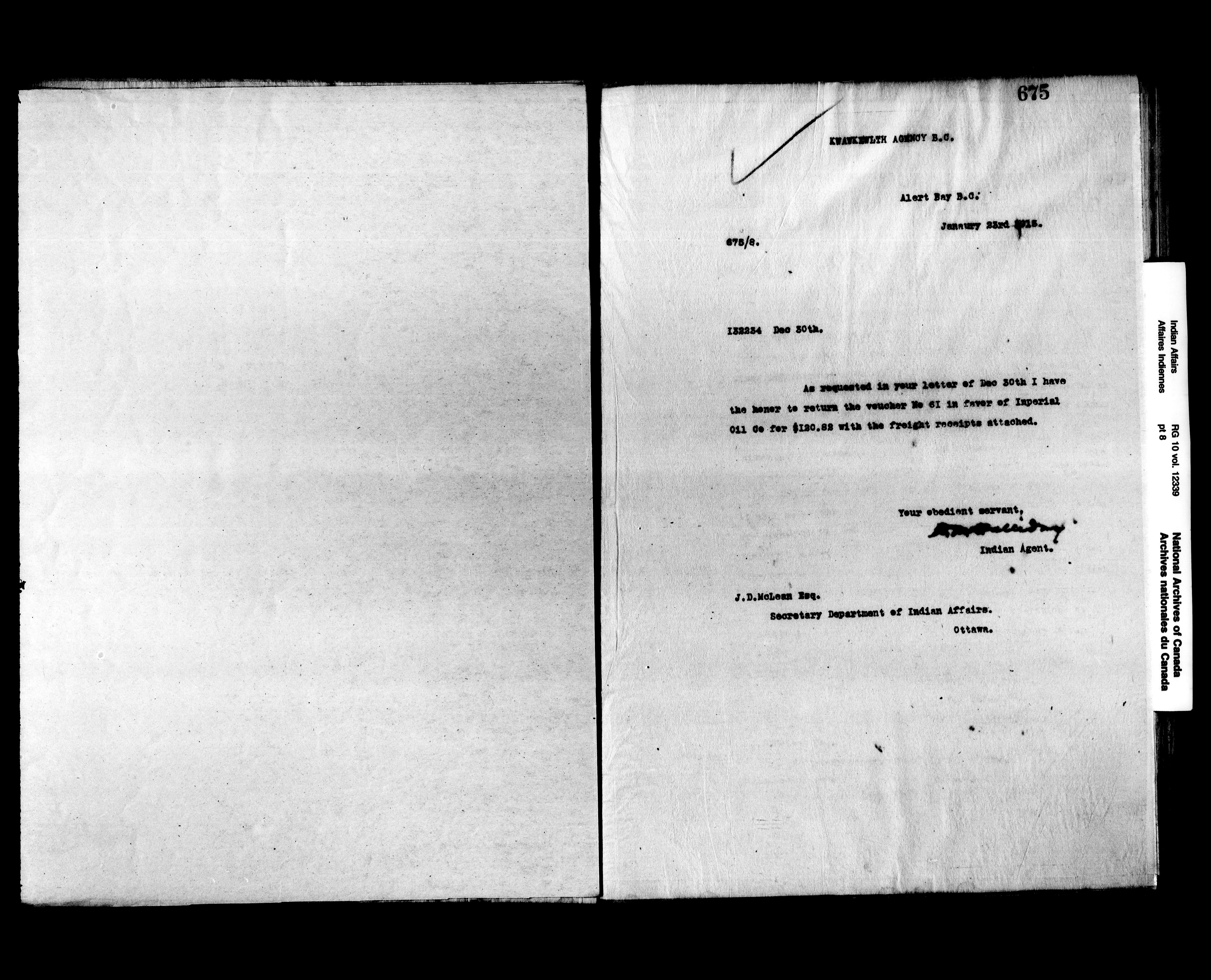 Letters written by the agent at Alert Bay (Kwawkewlth) Agency between 1908 and 1913 and between 1914 and 1920. - 16074