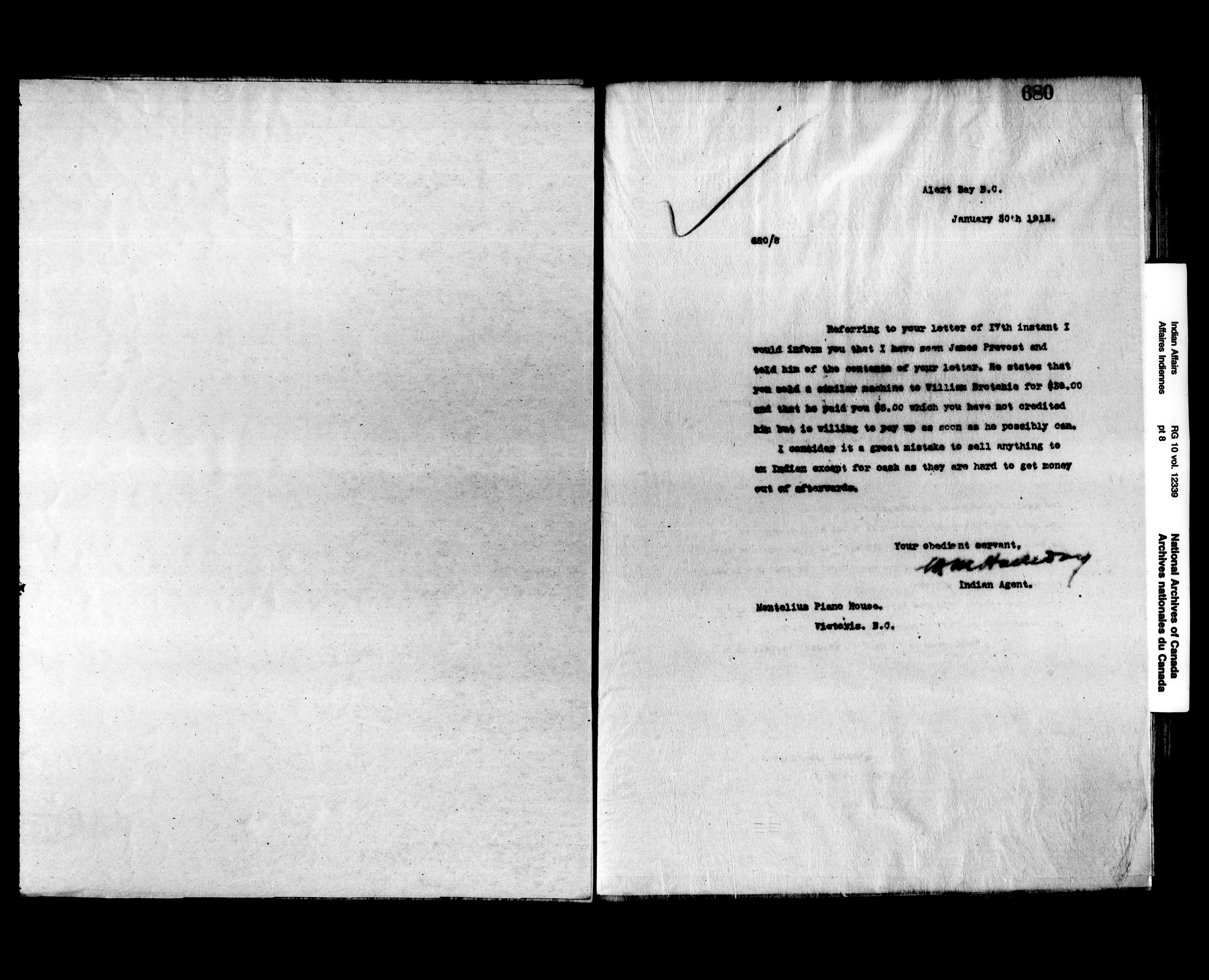 Letters written by the agent at Alert Bay (Kwawkewlth) Agency between 1908 and 1913 and between 1914 and 1920. - 16074