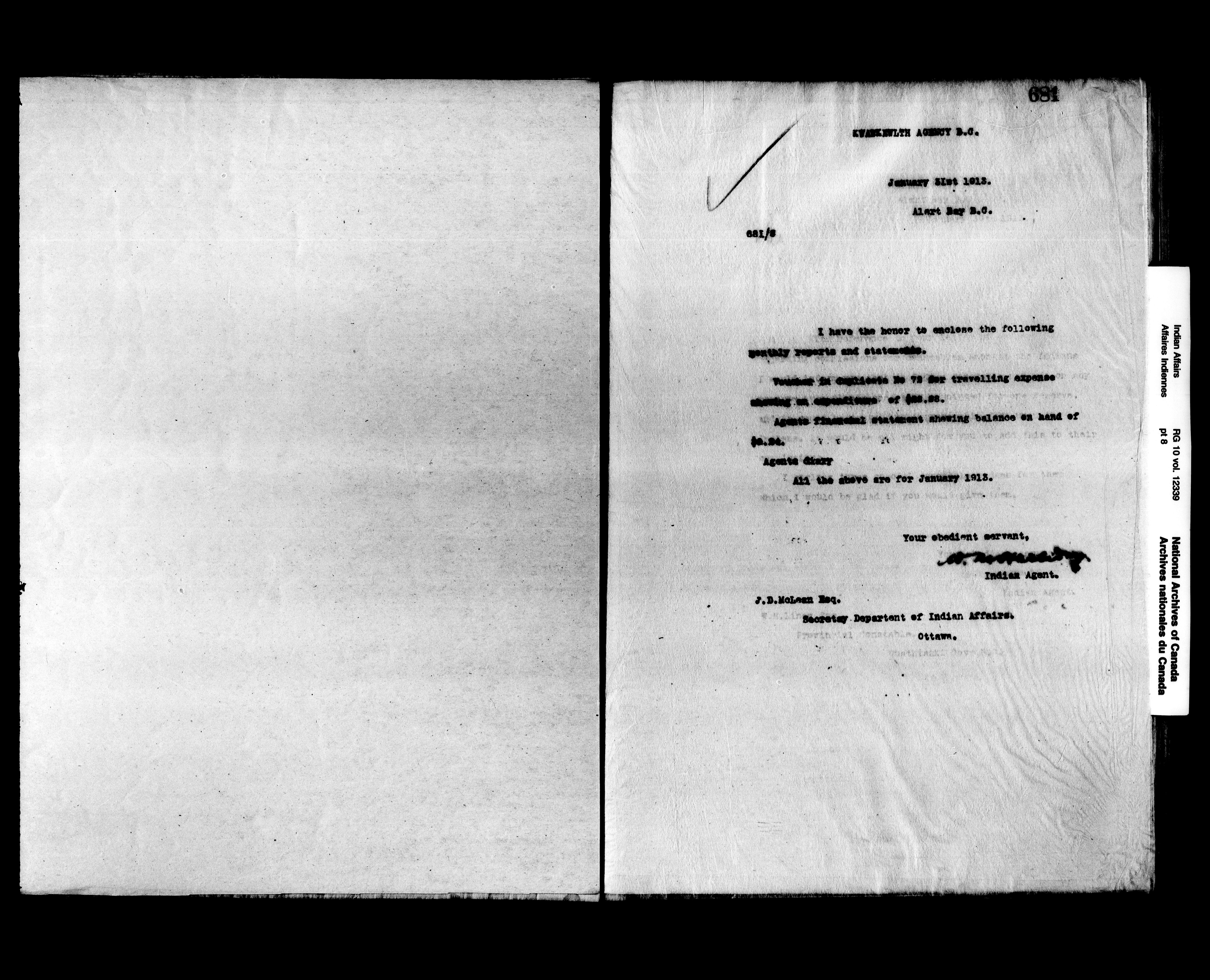 Letters written by the agent at Alert Bay (Kwawkewlth) Agency between 1908 and 1913 and between 1914 and 1920. - 16074