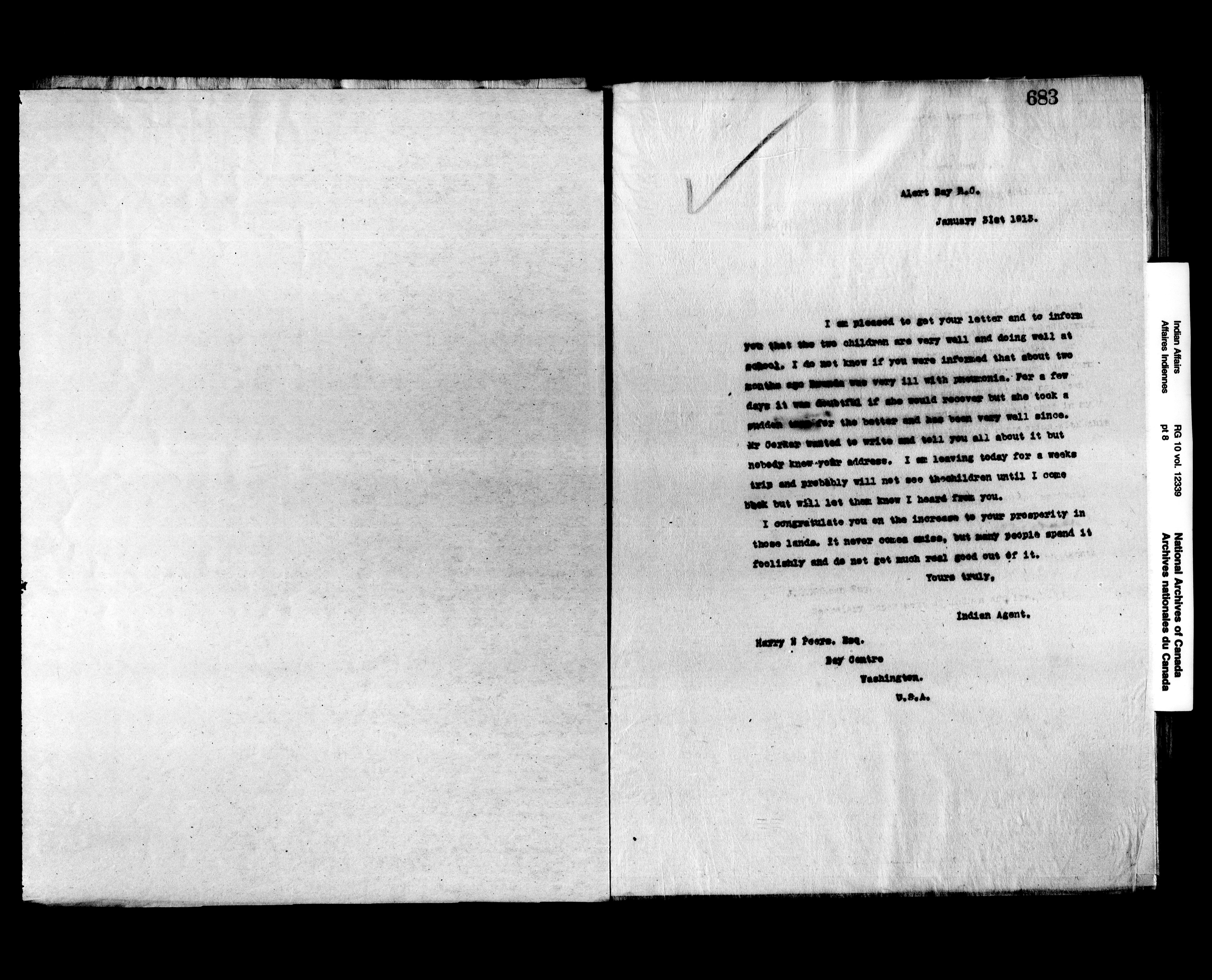 Letters written by the agent at Alert Bay (Kwawkewlth) Agency between 1908 and 1913 and between 1914 and 1920. - 16074
