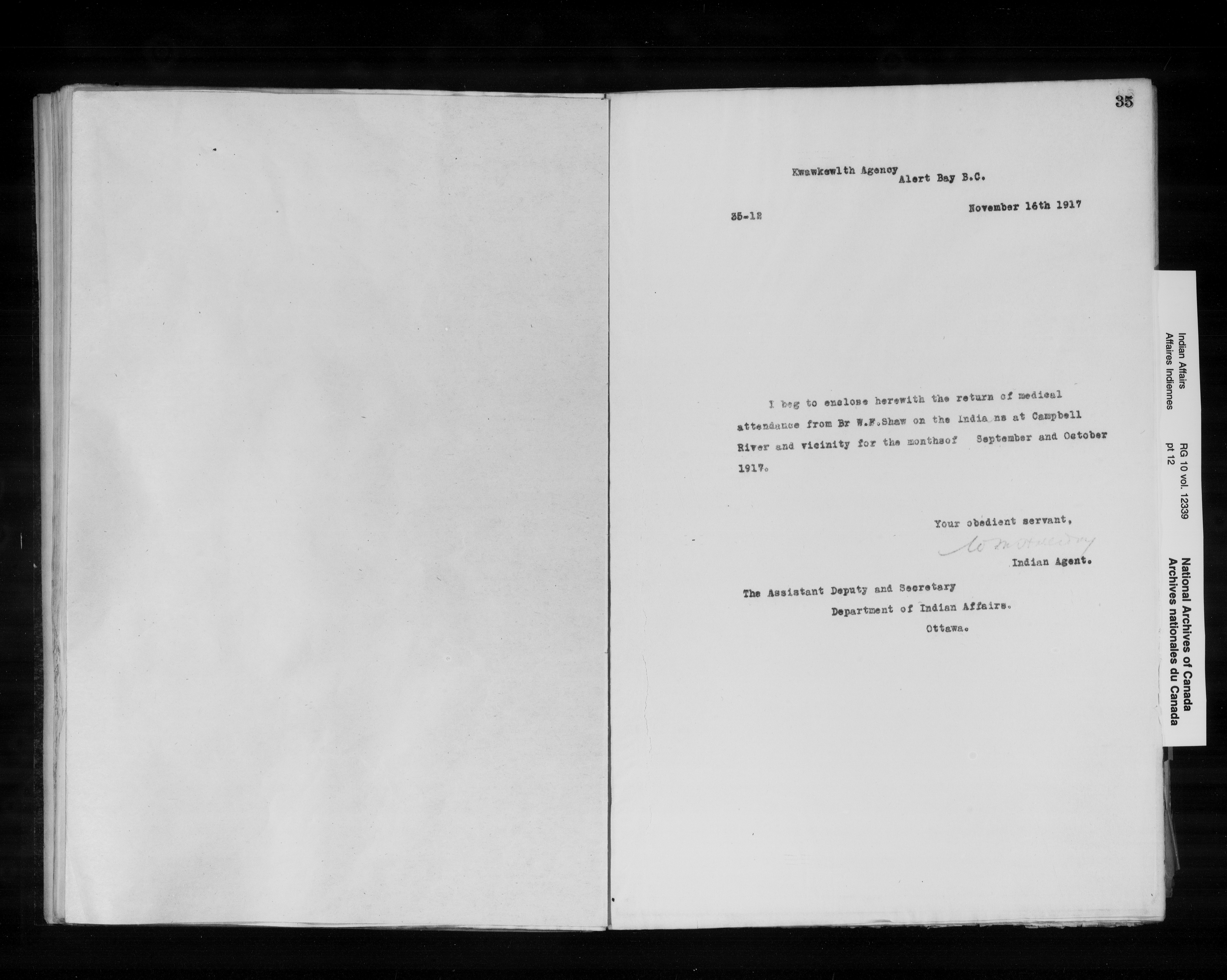 Letters written by the agent at Alert Bay (Kwawkewlth) Agency between 1908 and 1913 and between 1914 and 1920. - 16078