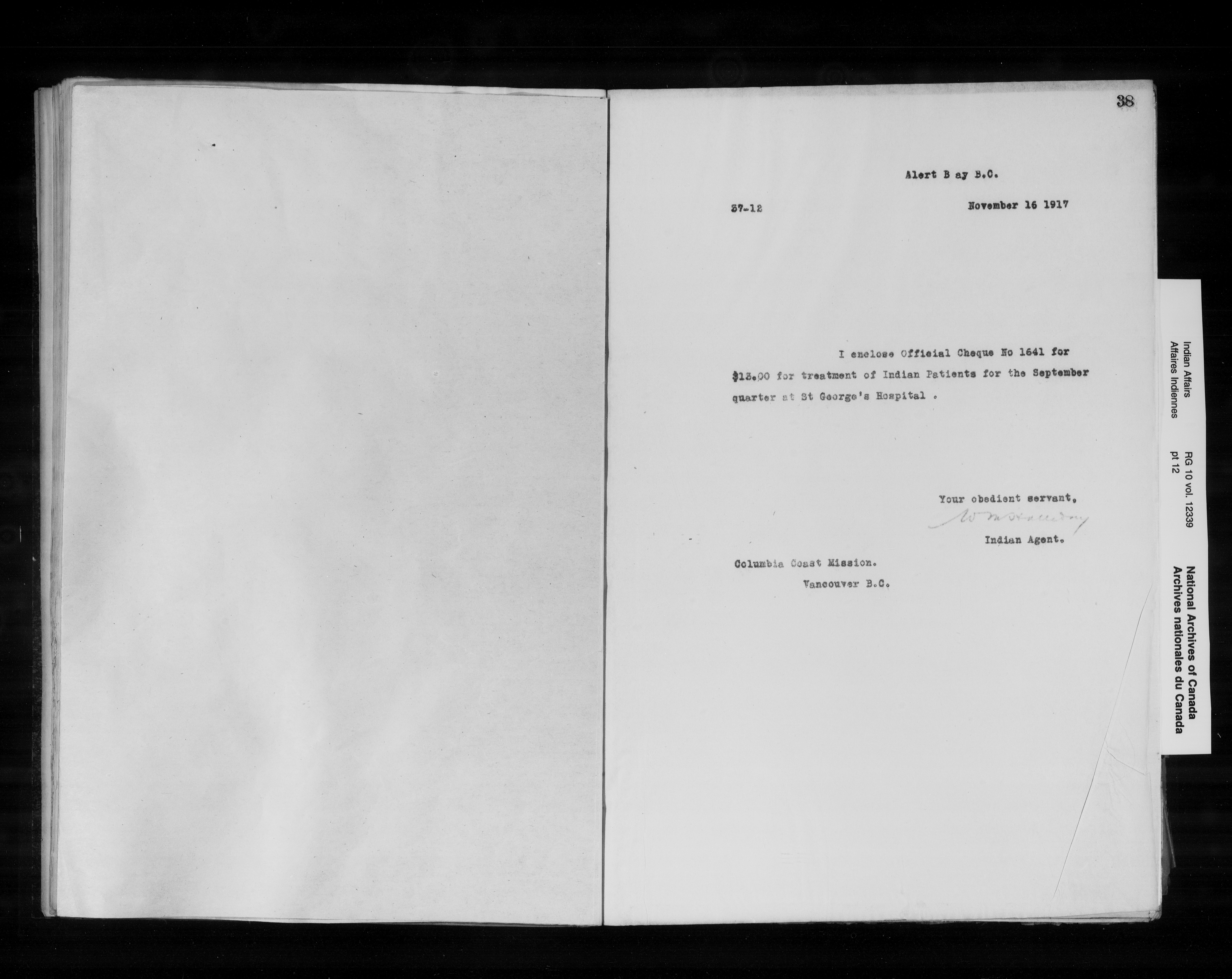 Letters written by the agent at Alert Bay (Kwawkewlth) Agency between 1908 and 1913 and between 1914 and 1920. - 16078