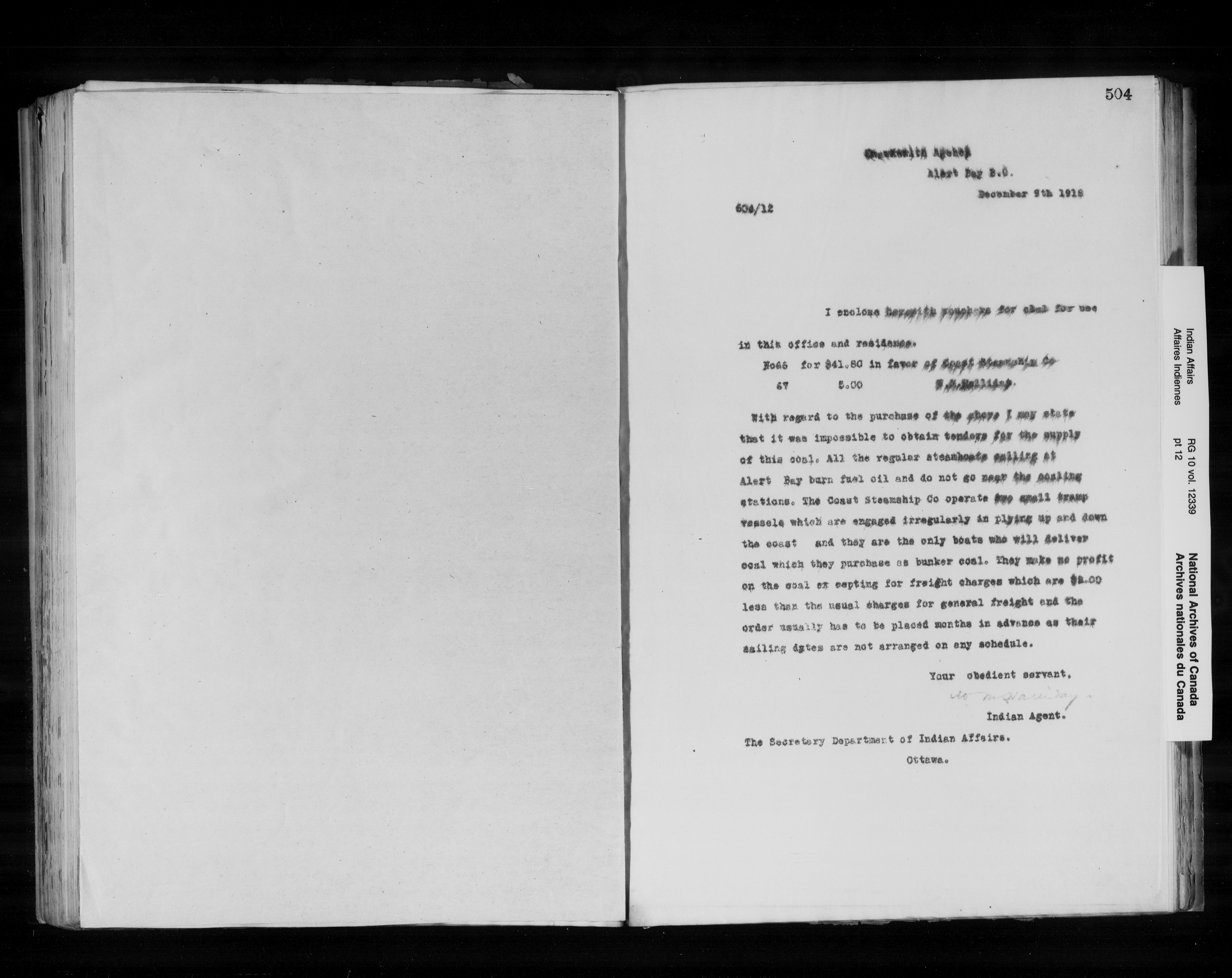 Letters written by the agent at Alert Bay (Kwawkewlth) Agency between 1908 and 1913 and between 1914 and 1920. - 16078