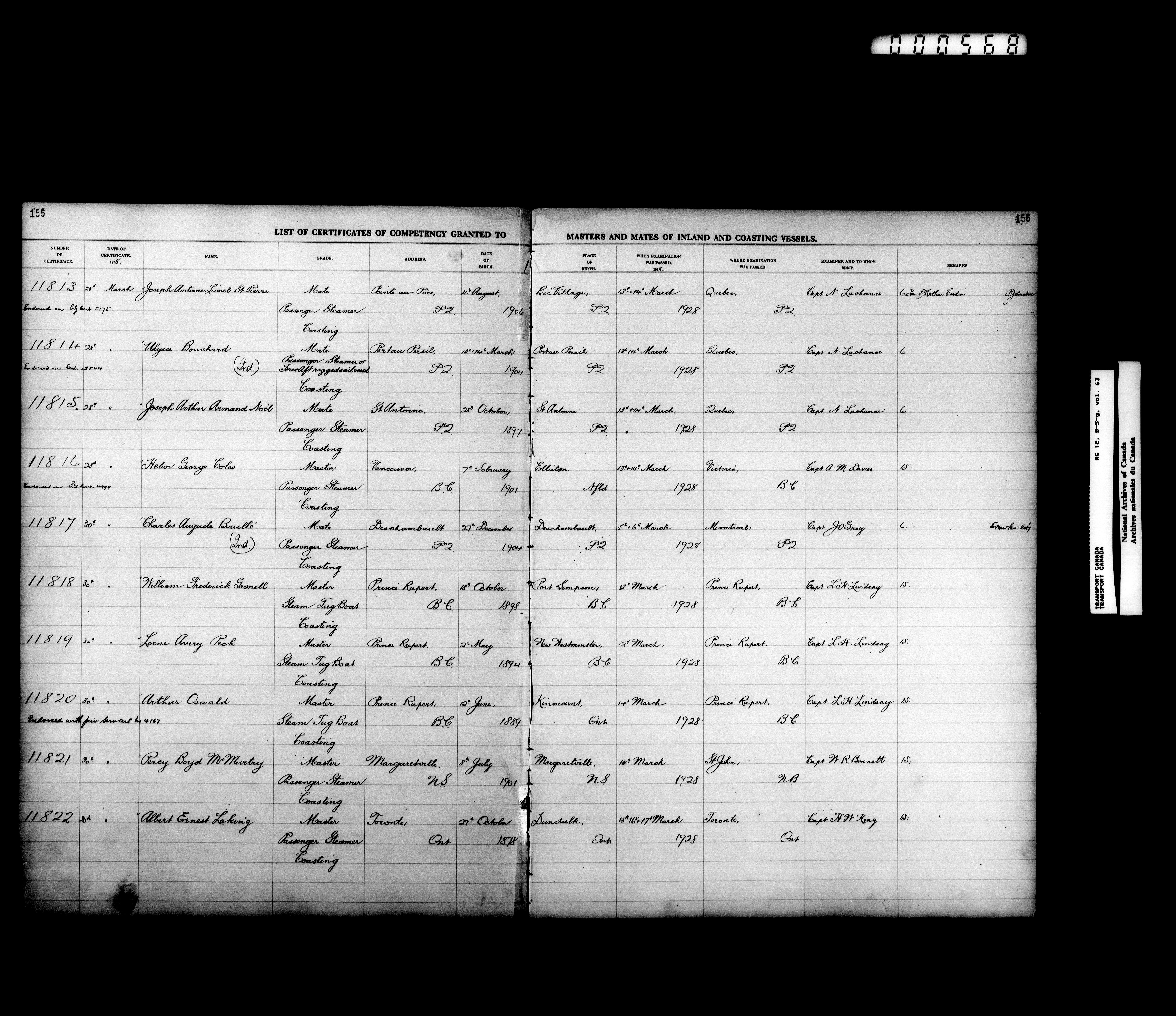 Department of Transport: Registers of marine certificates - 16136