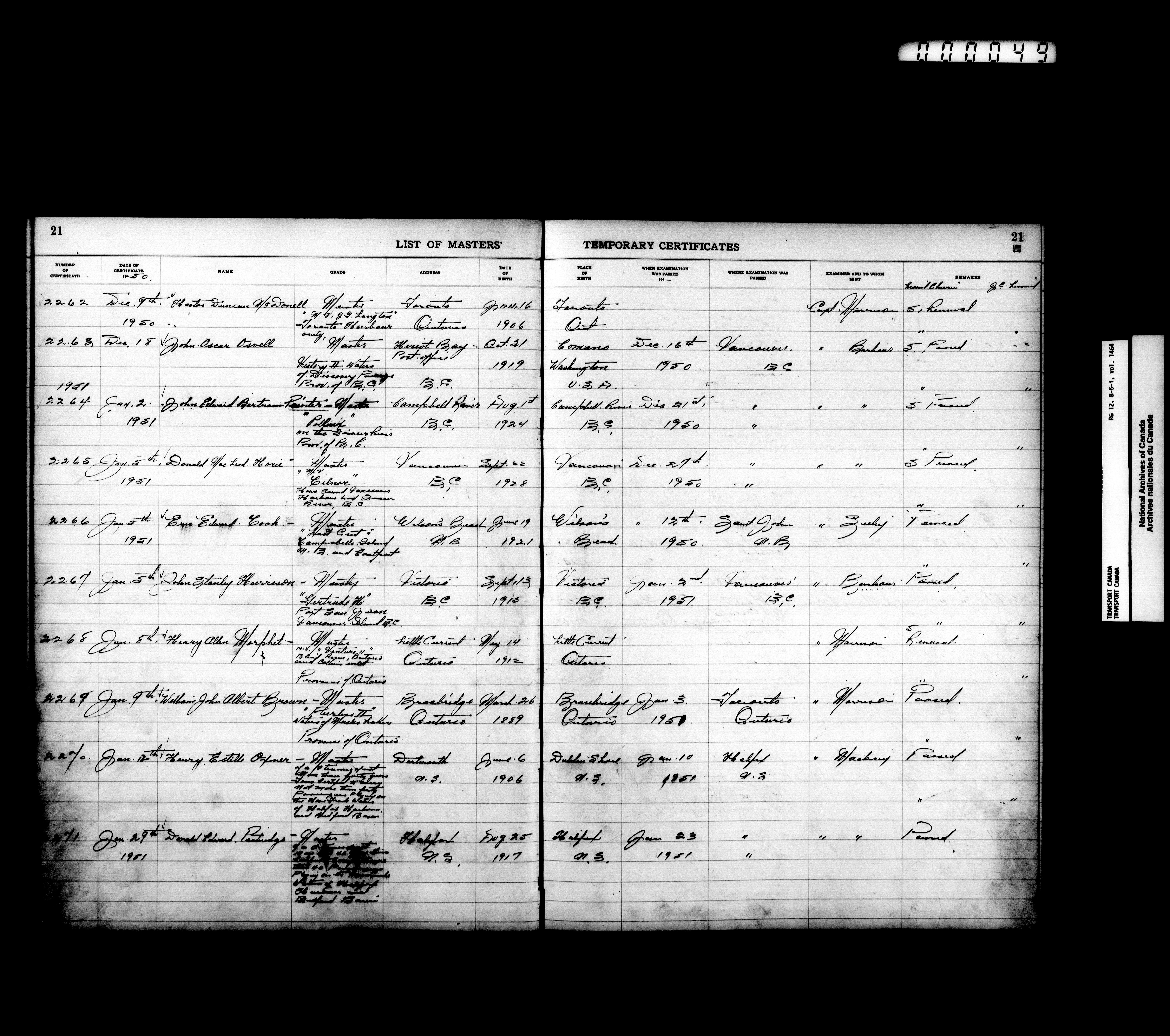 Department of Transport: Registers of marine certificates - 16140