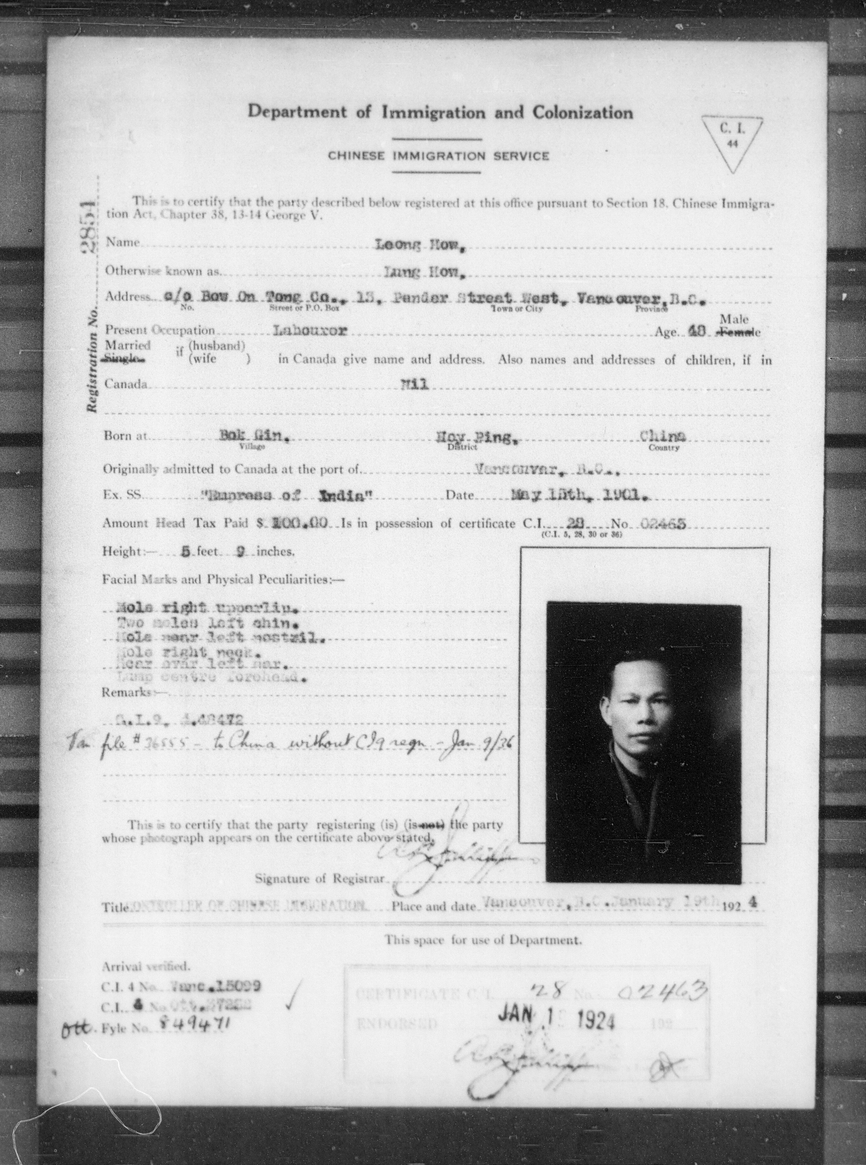 Chinese C.I. 44 forms and index cards of the Immigration Program (1923-1946)