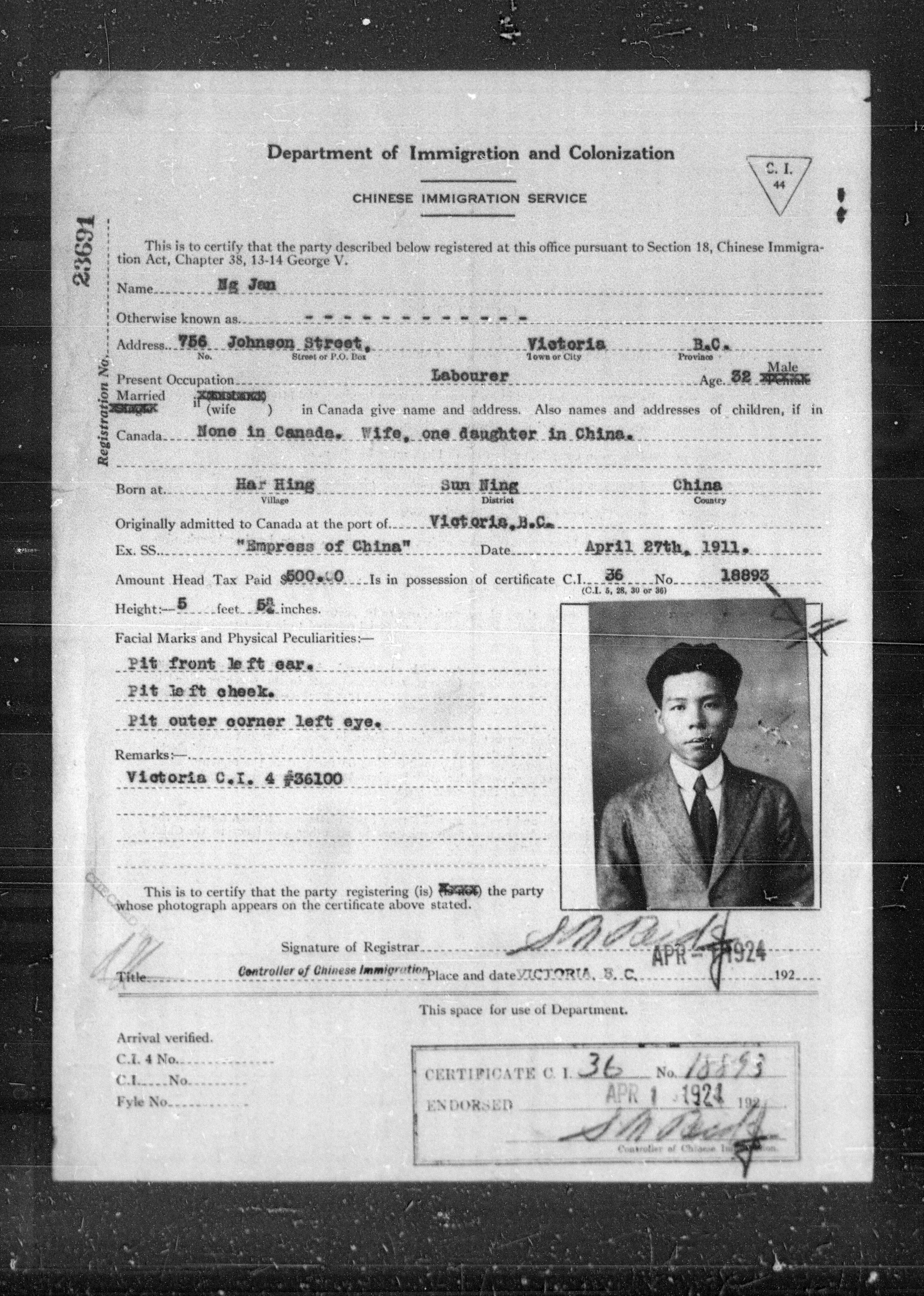 Chinese C.I. 44 forms and index cards of the Immigration Program (1923-1946) - T-16172