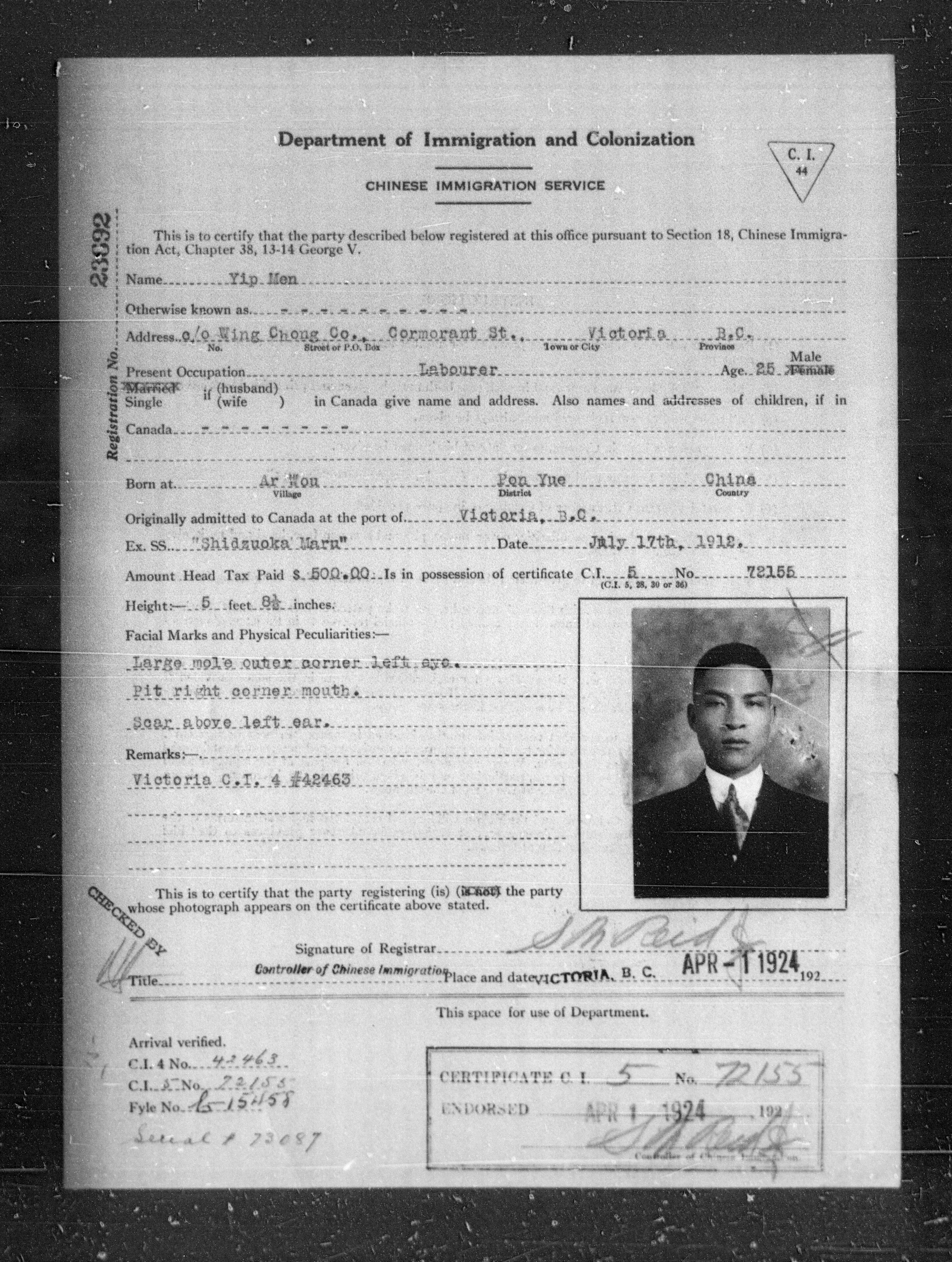 Chinese C.I. 44 forms and index cards of the Immigration Program (1923-1946) - T-16172