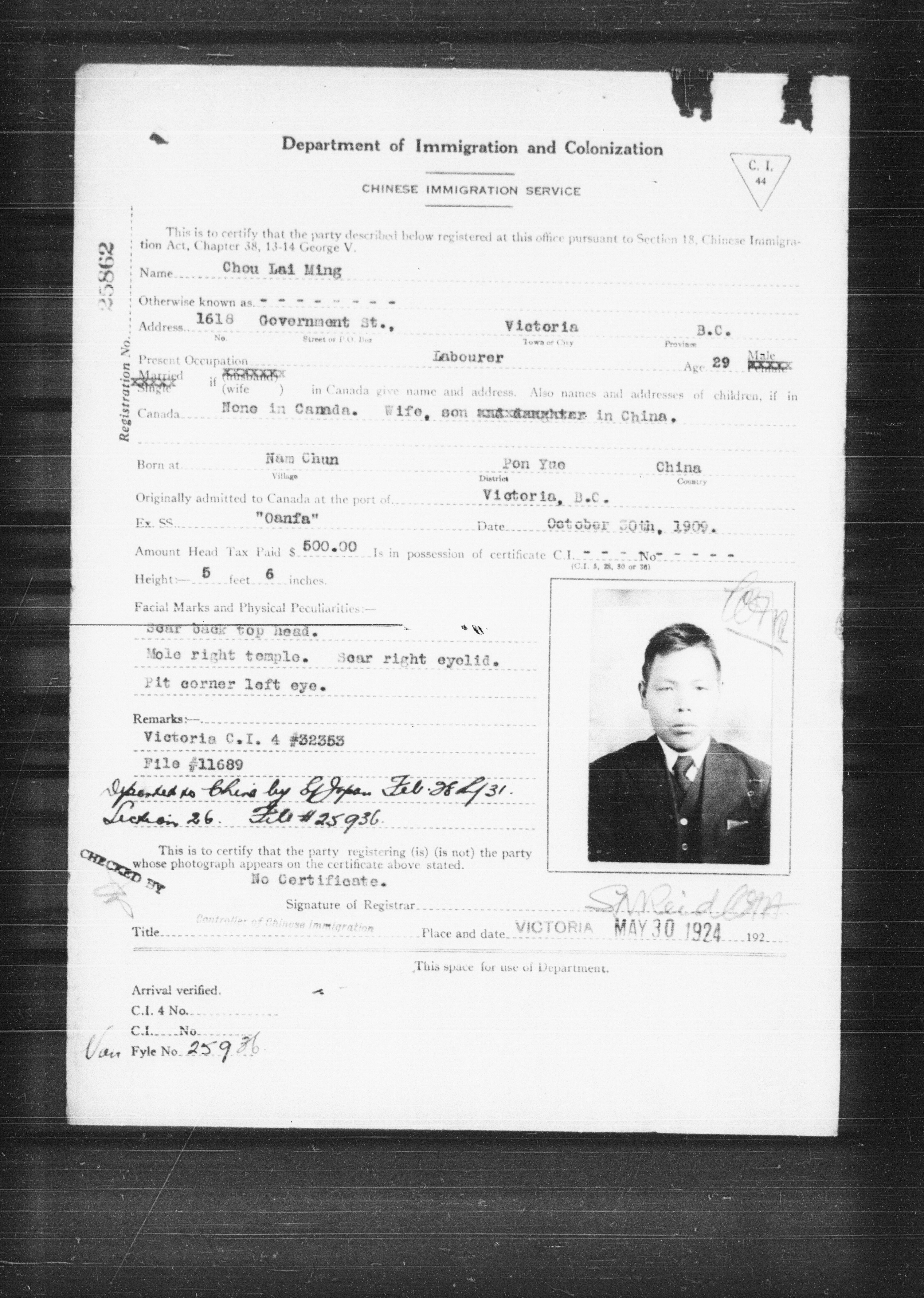 Chinese C.I. 44 forms and index cards of the Immigration Program (1923-1946) - T-16174
