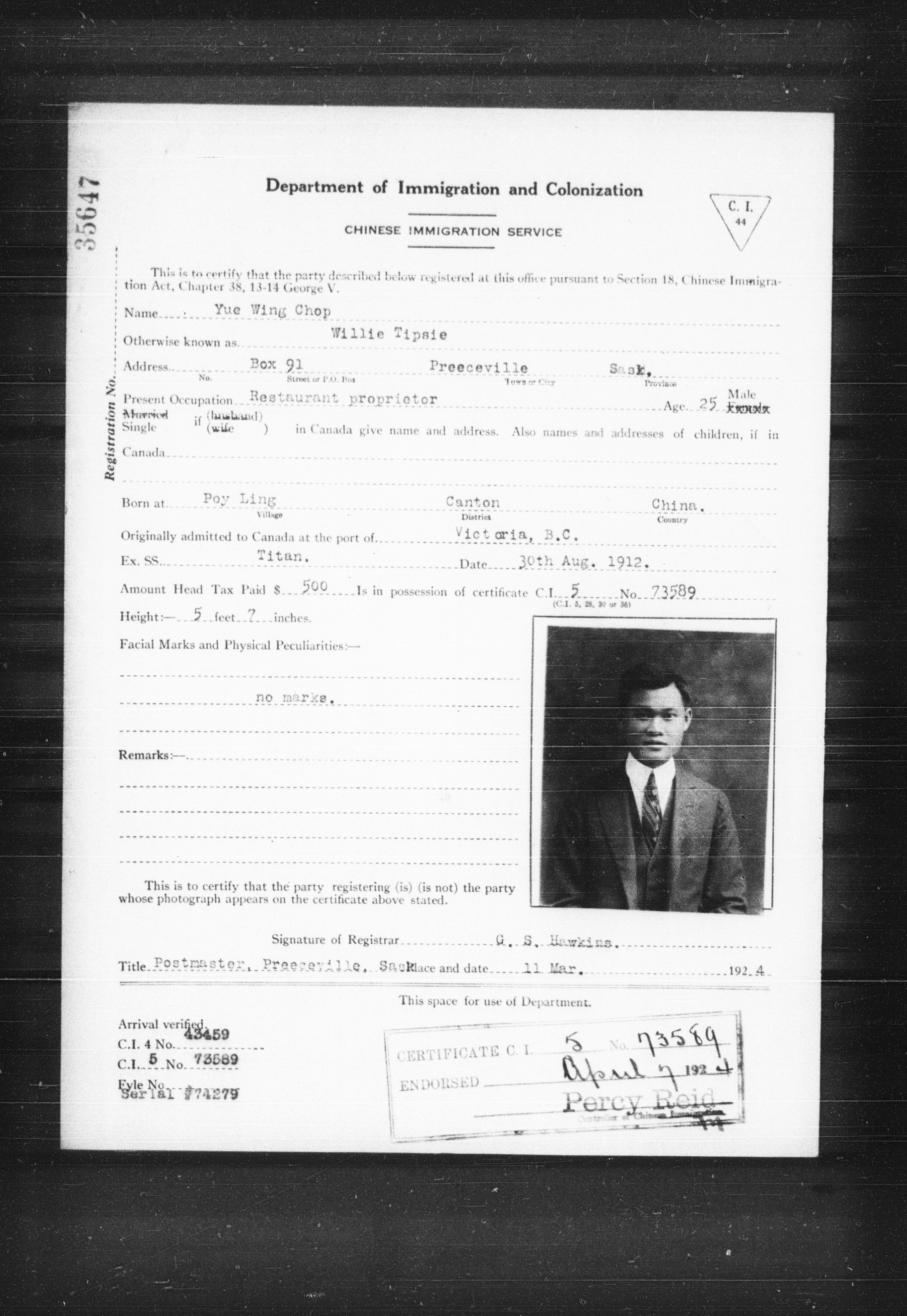 Chinese C.I. 44 forms and index cards of the Immigration Program (1923-1946) - T-16177