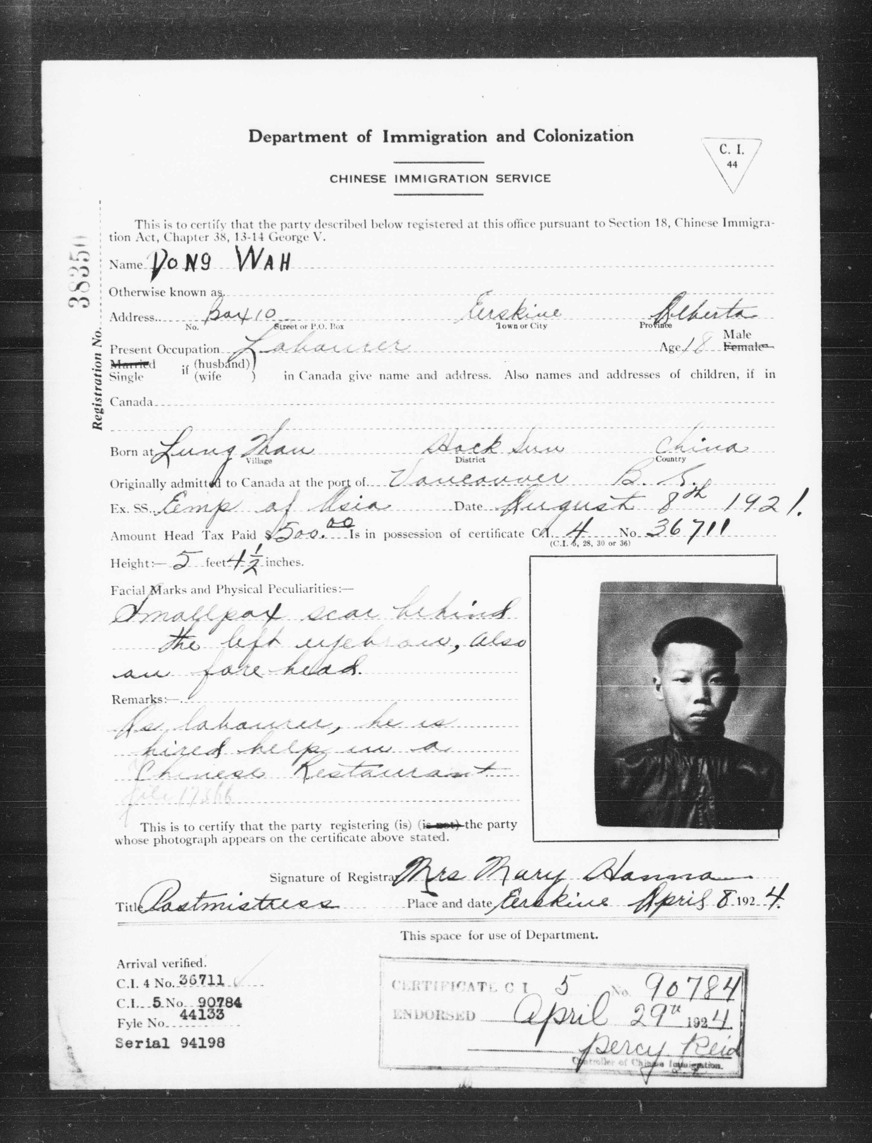 Chinese C.I. 44 forms and index cards of the Immigration Program (1923-1946) - T-16178