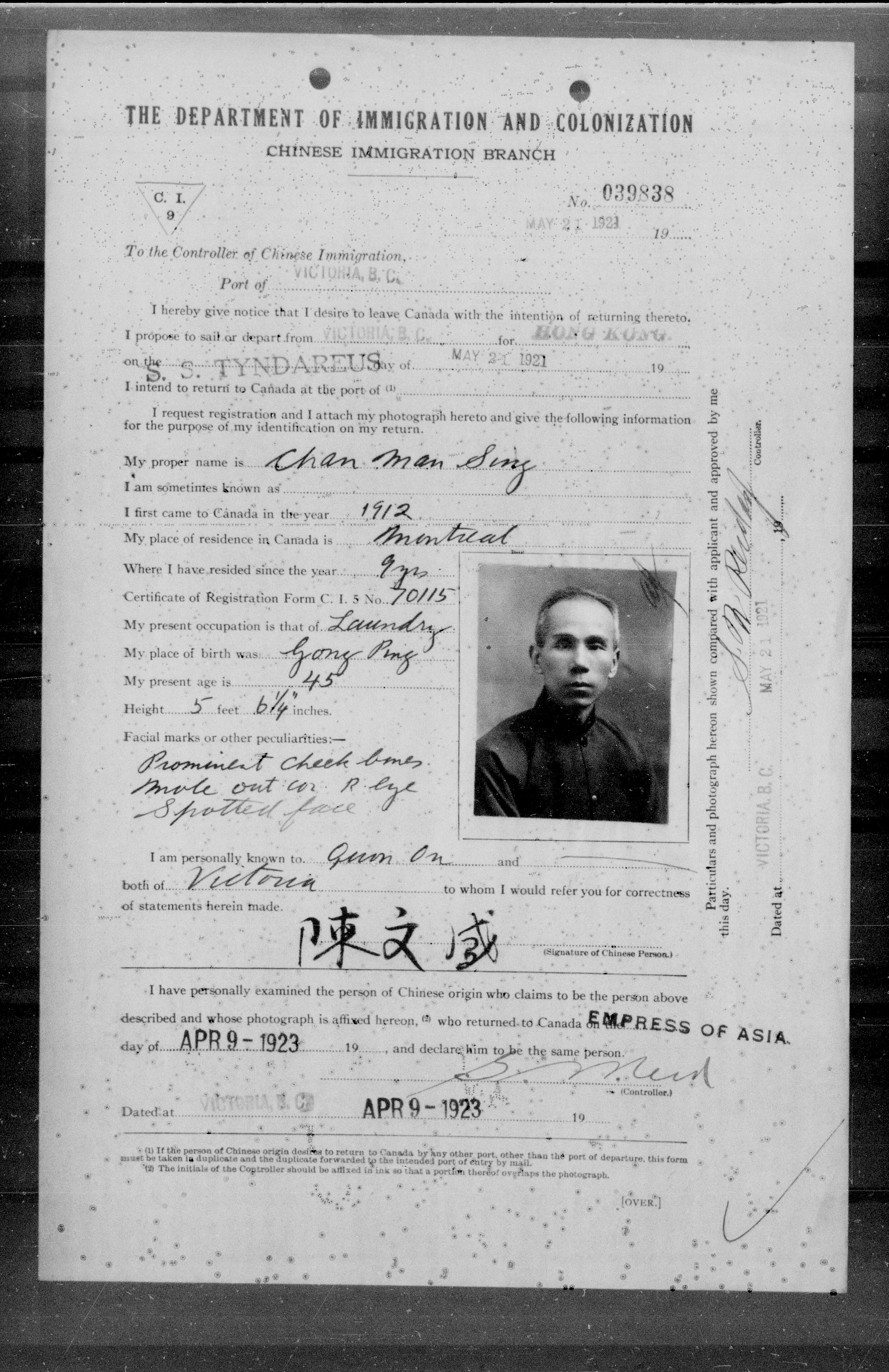 Chinese immigration records : C.I.9 certificates from Vancouver and Victoria